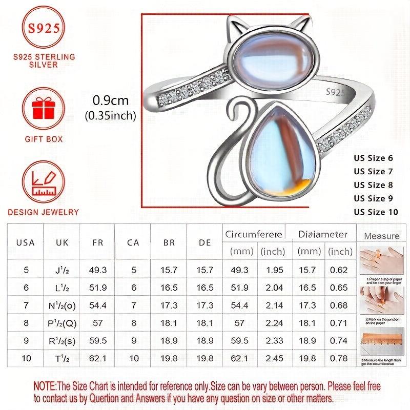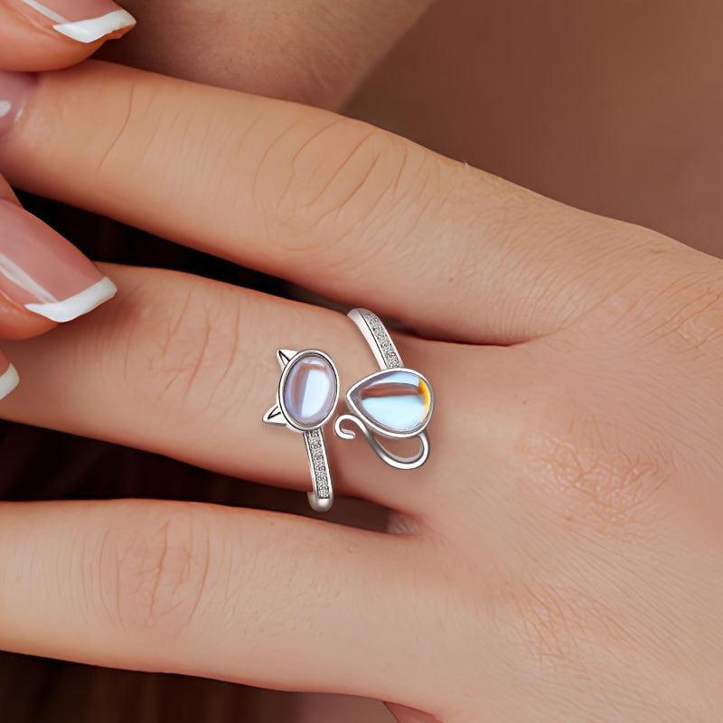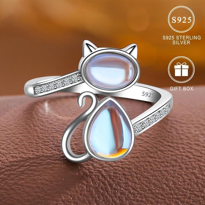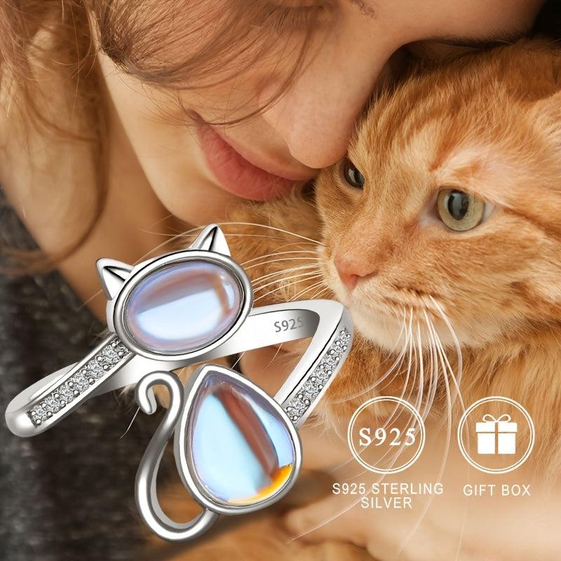 925 Silver Moonstone Cat Heart Ring Dance Party Jewelry