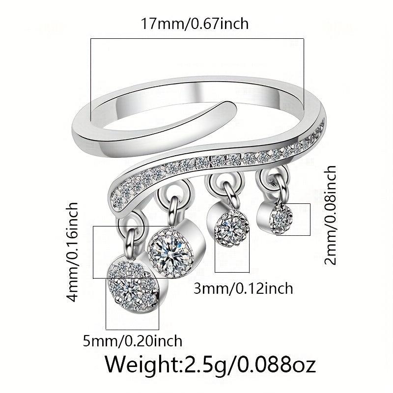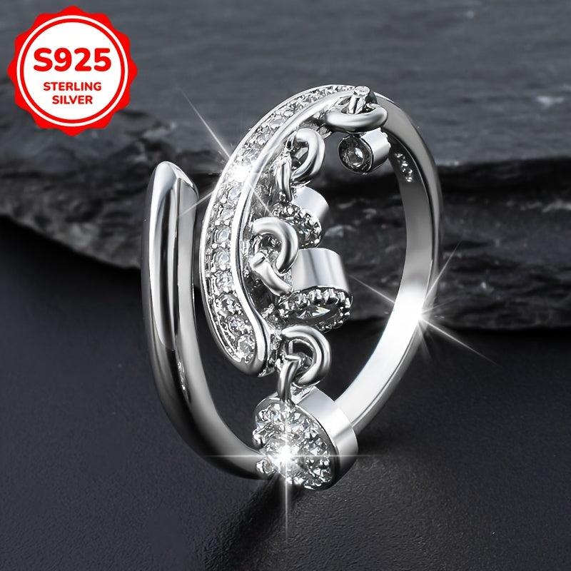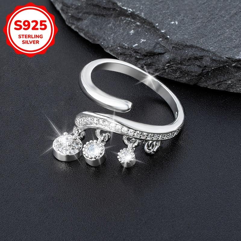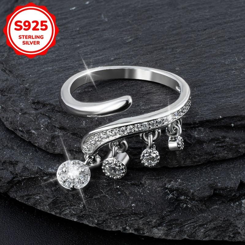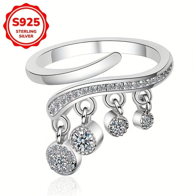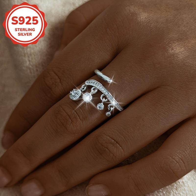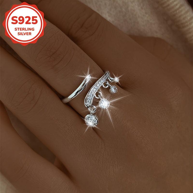 This 925 silver open ring features sparkling synthetic zirconia pendants, weighing 2.5g. It is hypoallergenic and perfect for casual attire or gifting.