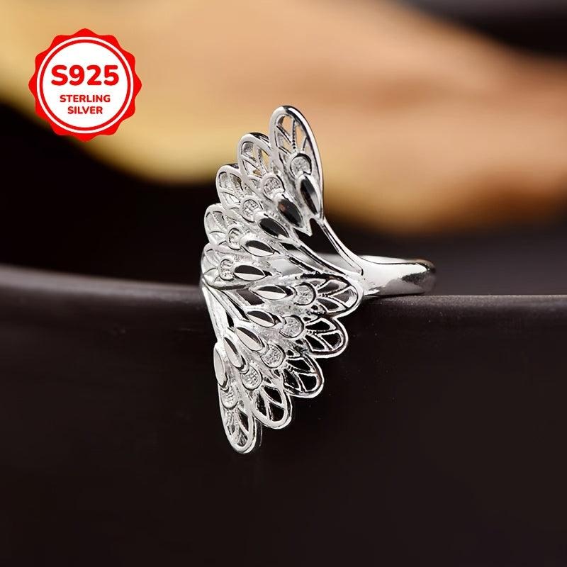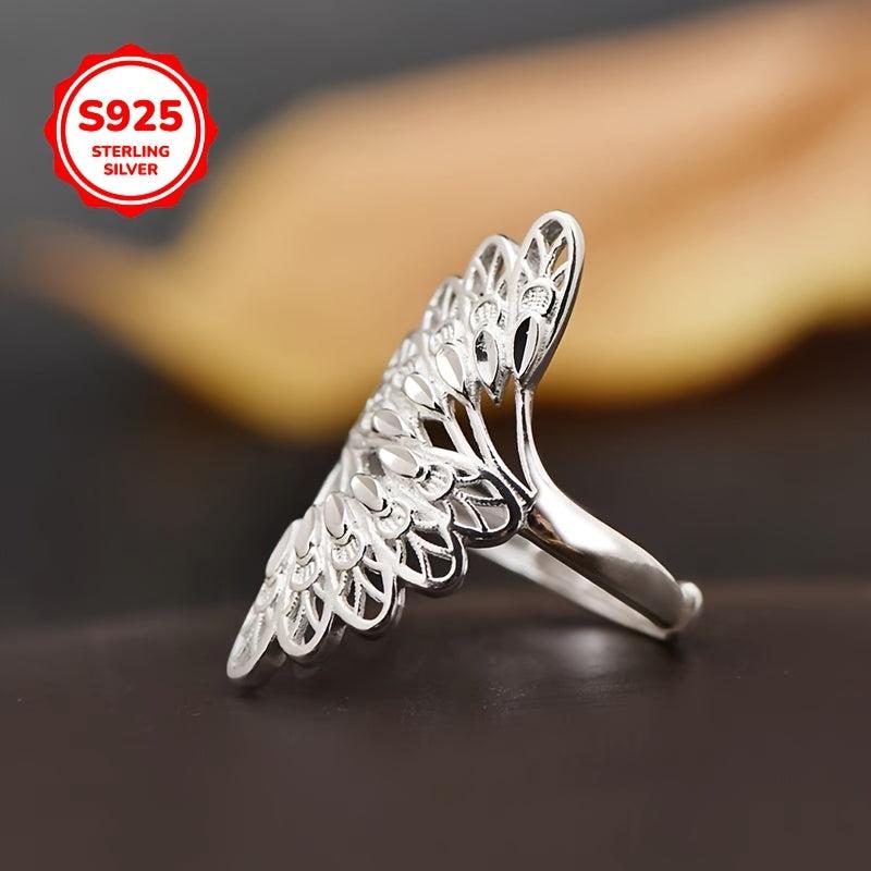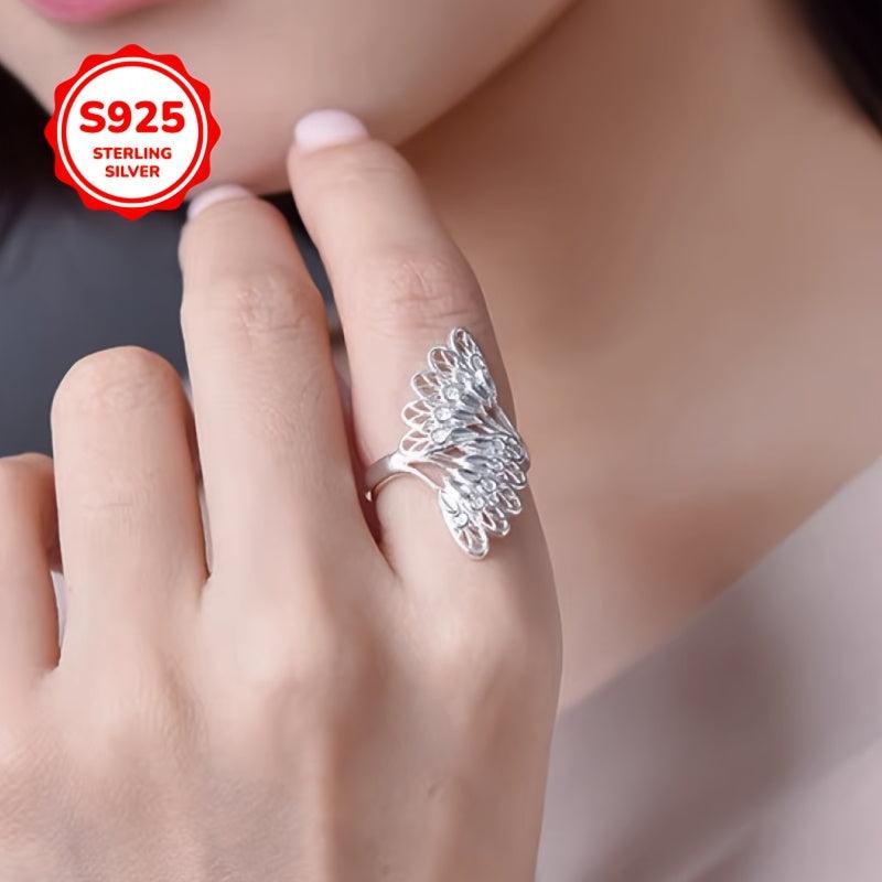 925 Silver Peacock Feather Ring Adjustable Open Band Gift for Women