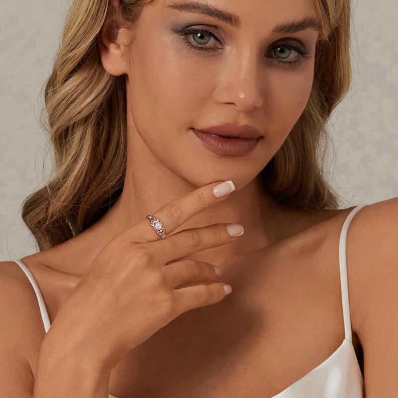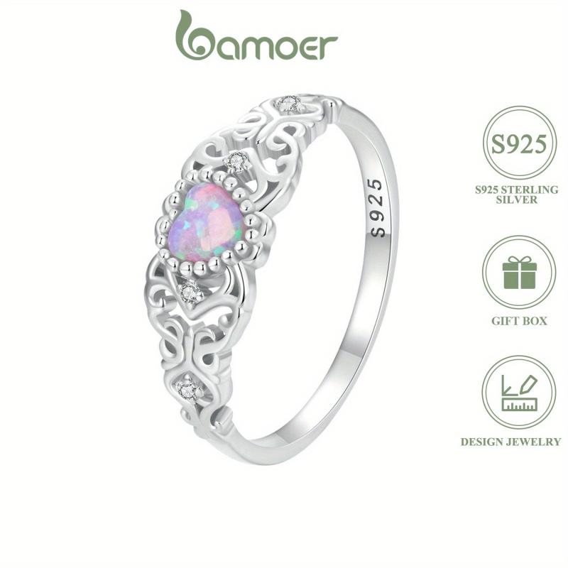 Indulge in the beauty of this 925 sterling silver ring featuring a pink synthetic opal and synthetic zirconia. The intricate retro patterns add a touch of elegance and charm, making it a perfect symbol of love and beauty.