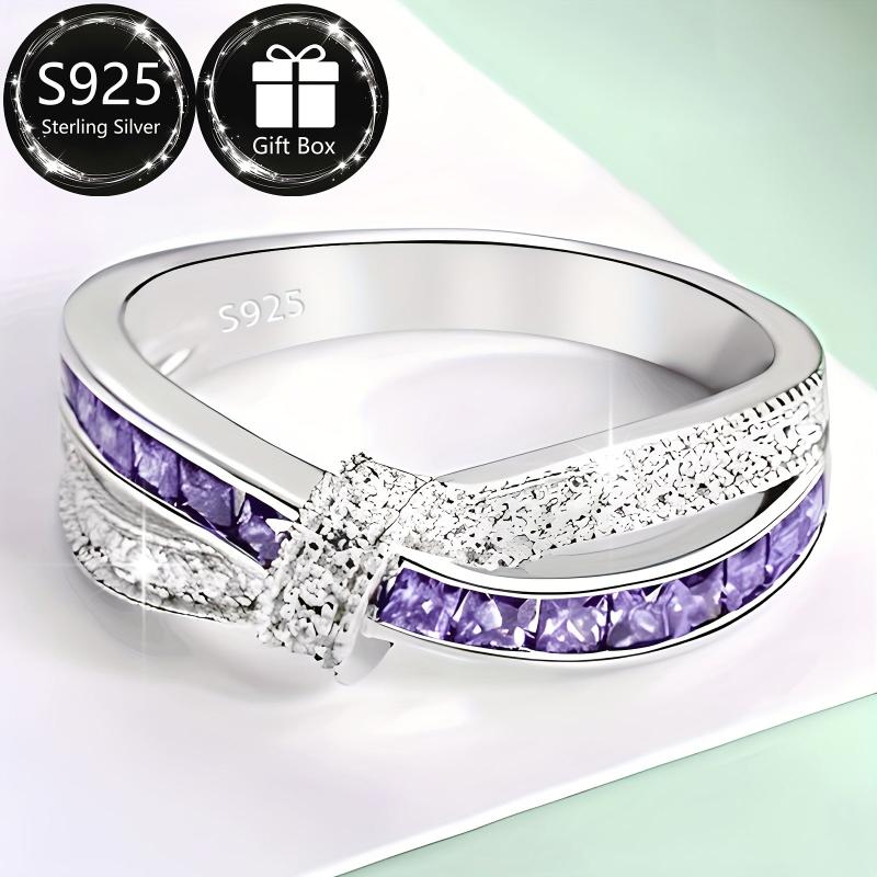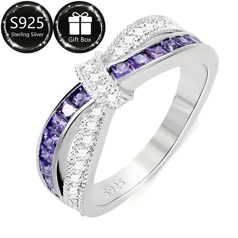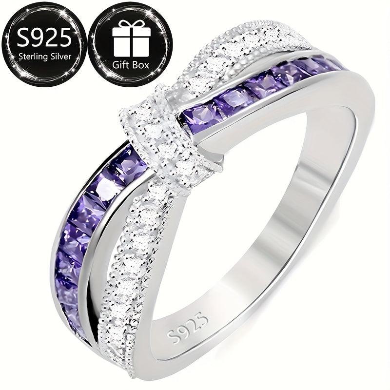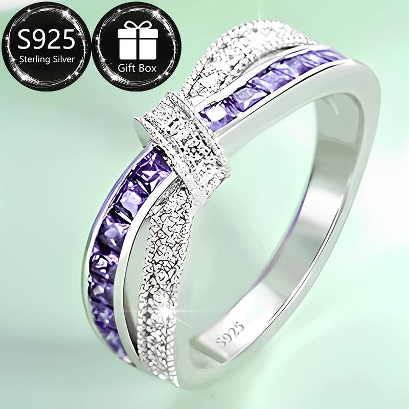 Elegant 925 sterling silver ring with crossbow design and purple zirconia, perfect for daily wear, parties, and holidays.