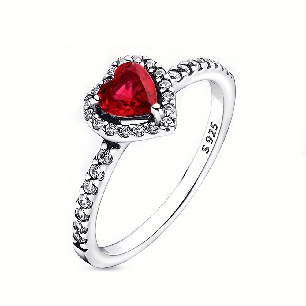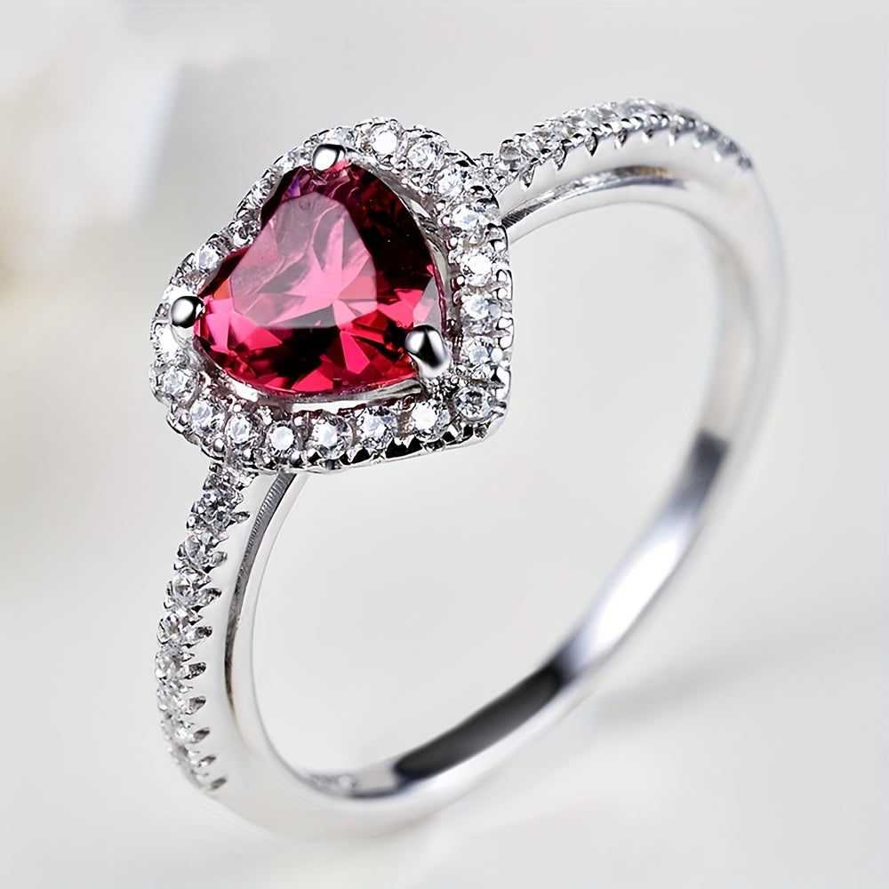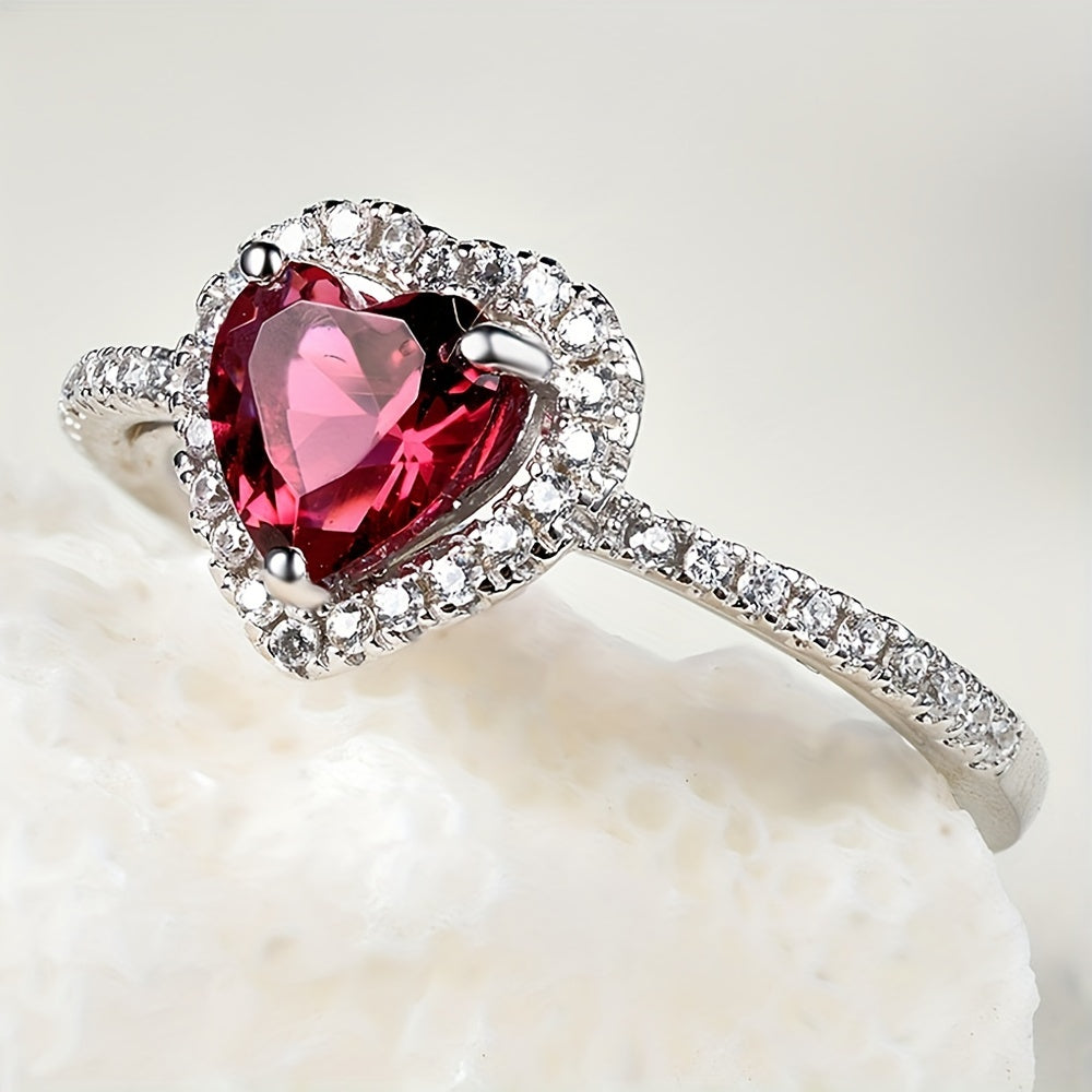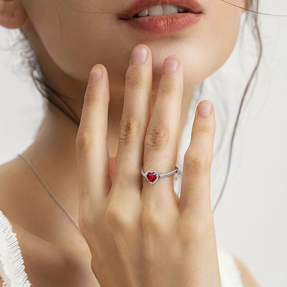 This stunning 925 sterling silver ring features a beautiful red love-shaped faux gemstone. Perfect for weddings, banquets, or as a thoughtful jewelry gift.