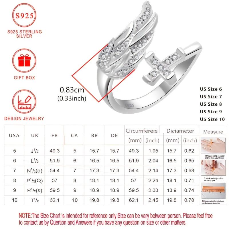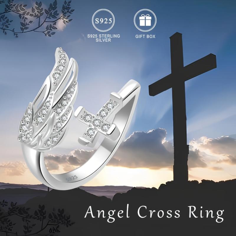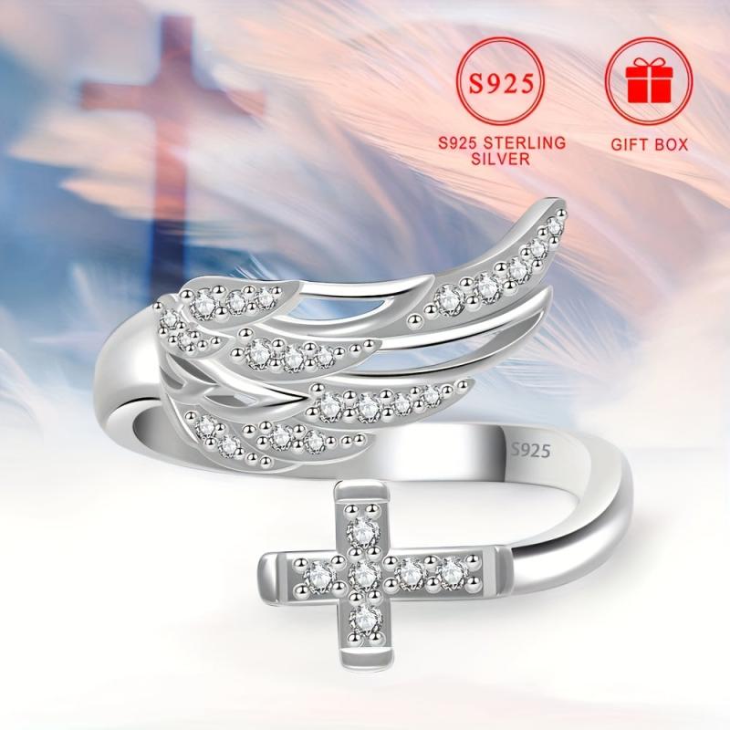 Elegant 925 sterling silver ring featuring a cross and angel wings design, perfect for birthdays. Comes in a beautiful included box.
