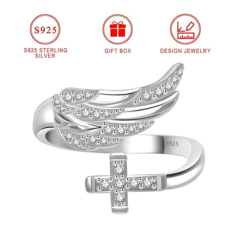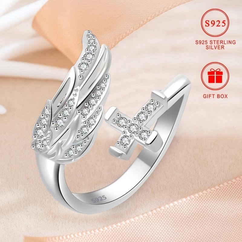 925 Silver Ring Cross Angel Wings Women's Adjustable Cuff Ring