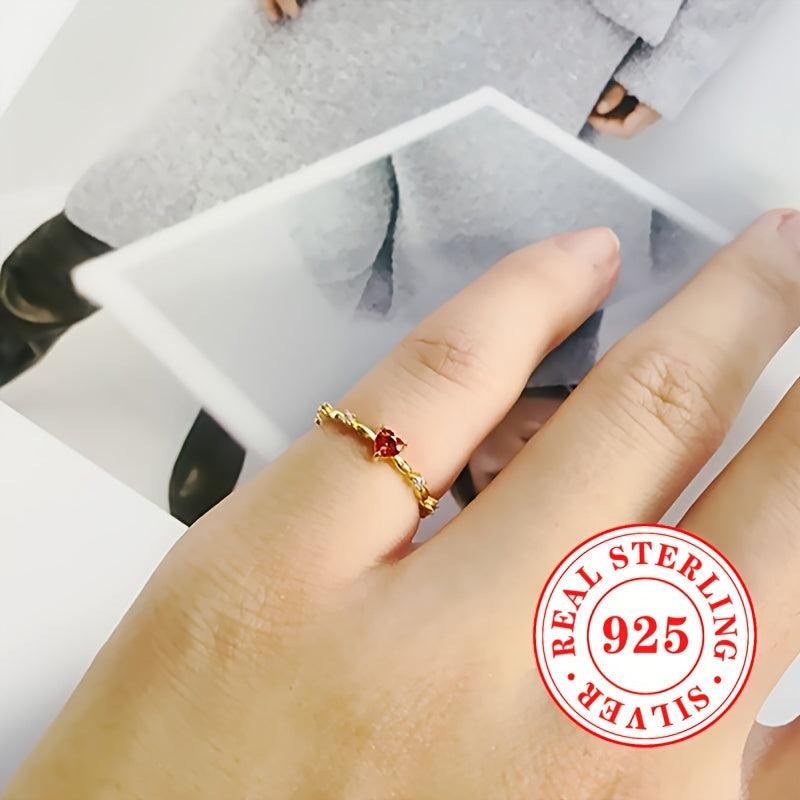This elegant ring is crafted from 925 sterling silver and features a red synthetic zirconia heart, perfect for weddings and engagements.