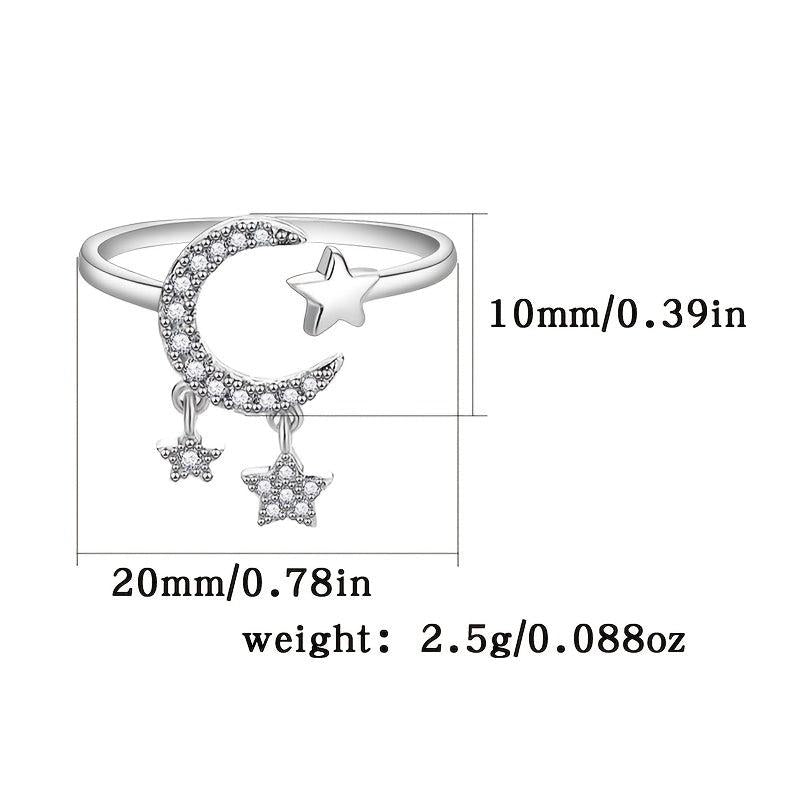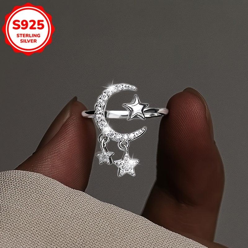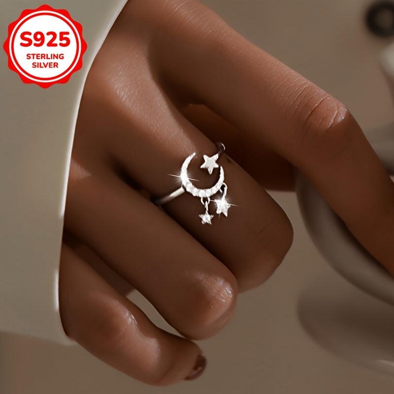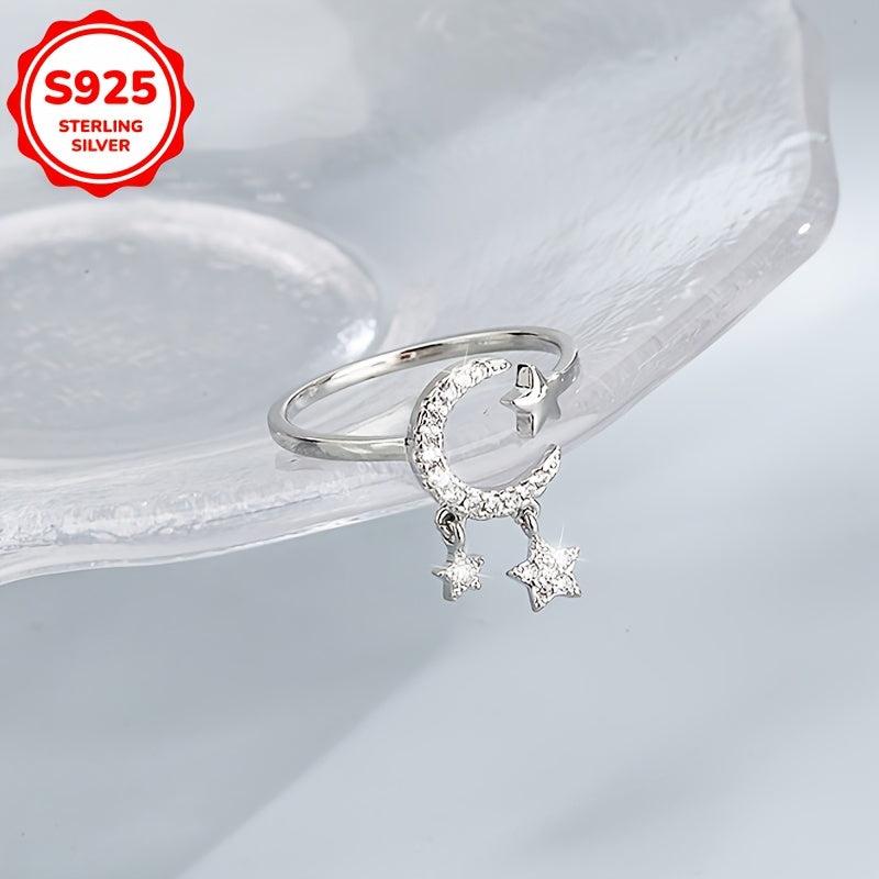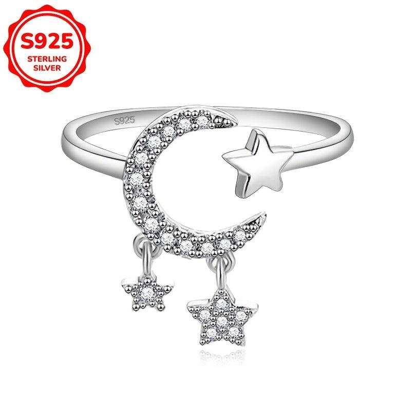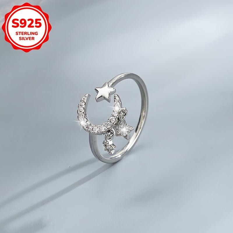 Dazzle with this fashionable ring featuring stars and moon design. Made of 925 silver, this lightweight ring is perfect for daily wear, vacations, or as a Valentine's Day gift.