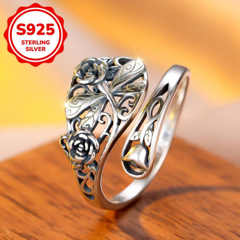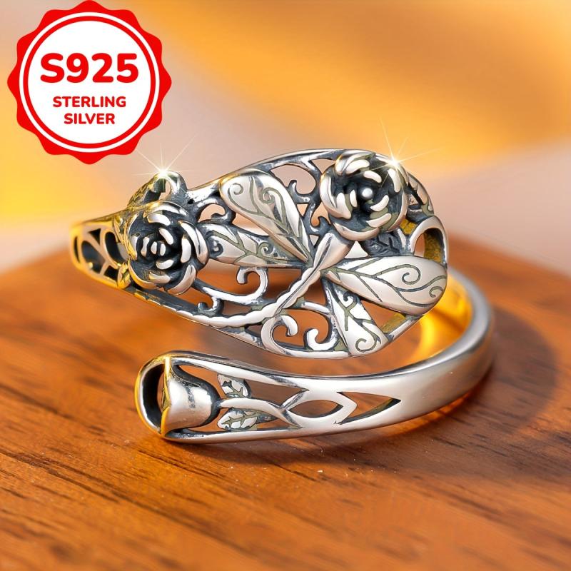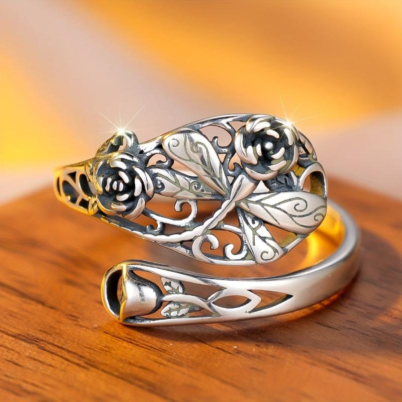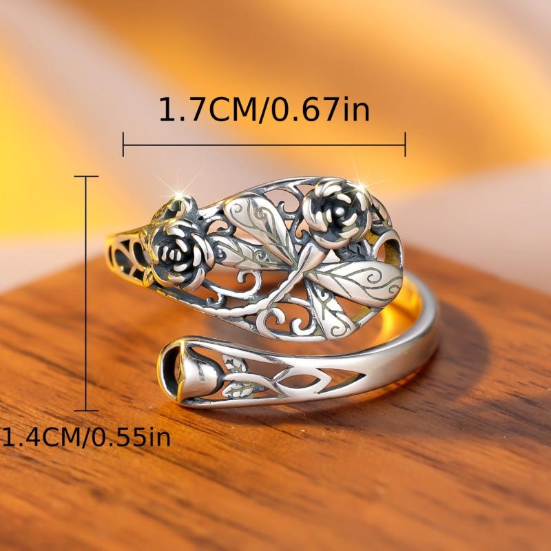 Elegant and unique, this 925 sterling silver ring features a beautiful rose and dragonfly design. Perfect for weddings and formal events, this adjustable ring is a stunning accessory that adds a touch of bohemian style to any outfit.