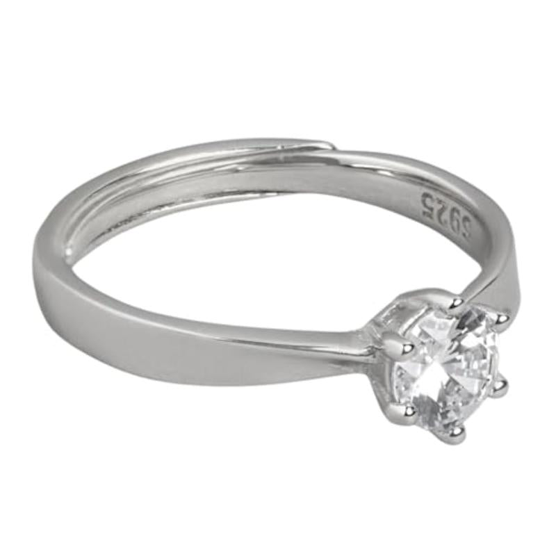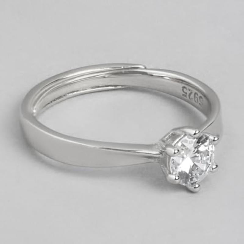 This stunning solitaire ring is made of 925 sterling silver with a rhodium plating for a brilliant shine. It features a single shimmering stone in a classic setting. The ring is stamped with a 925 hallmark for authenticity.