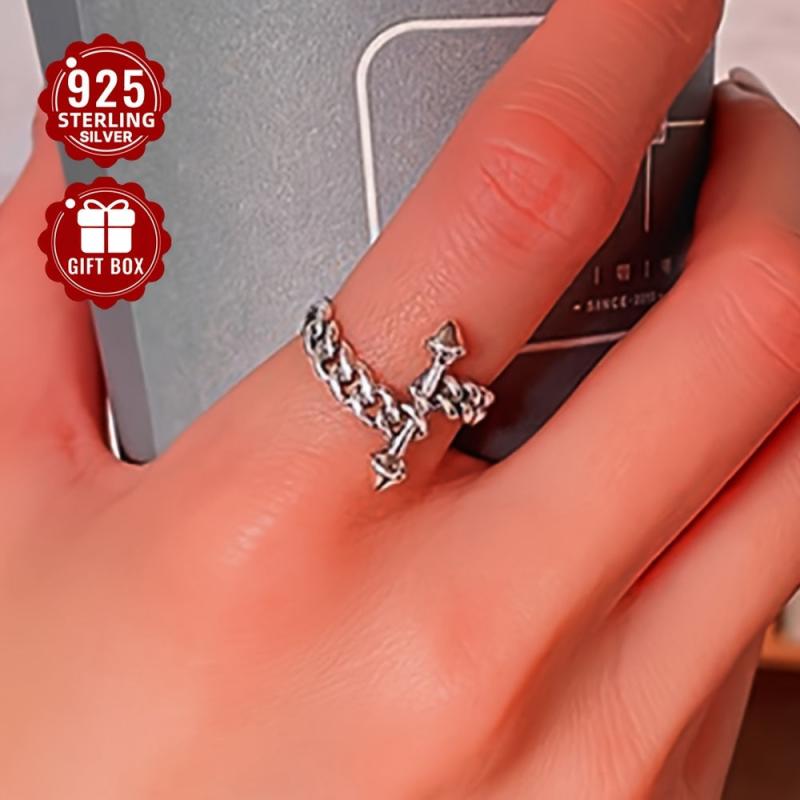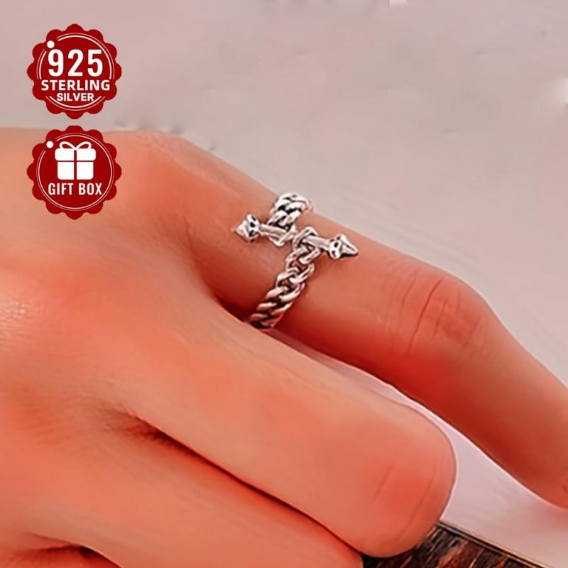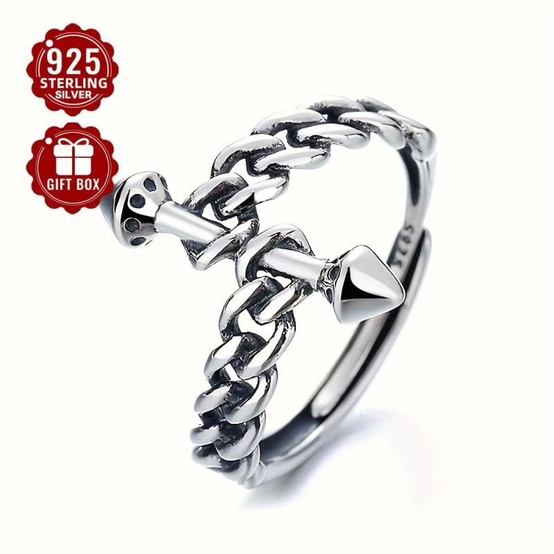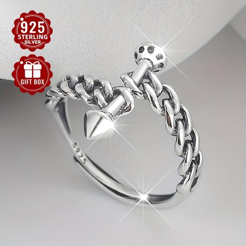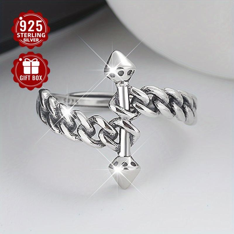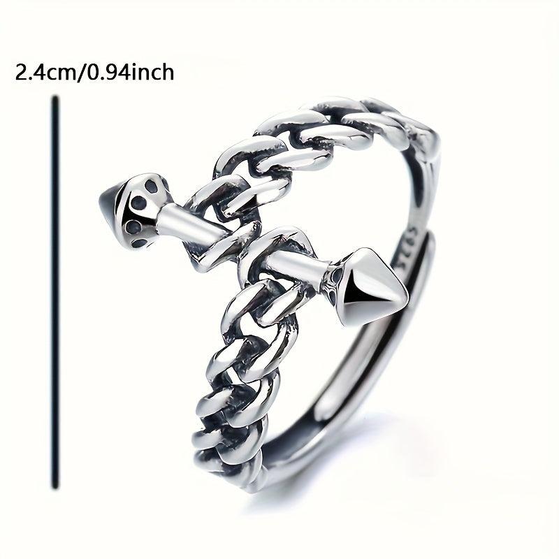 This unique ring features an irregular chain design with a pointed hammer accent. Made of hypoallergenic 925 sterling silver, suitable for both men and women.
