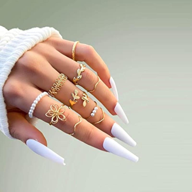 Add a touch of elegance to your outfit with this set of 10 plated floral finger rings. Each ring is adjustable to fit all finger sizes.