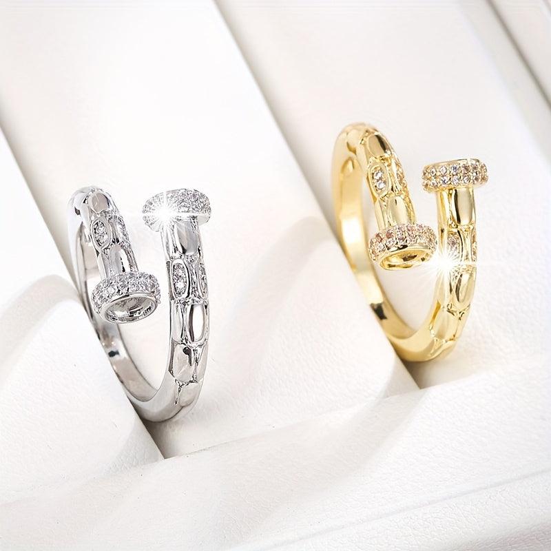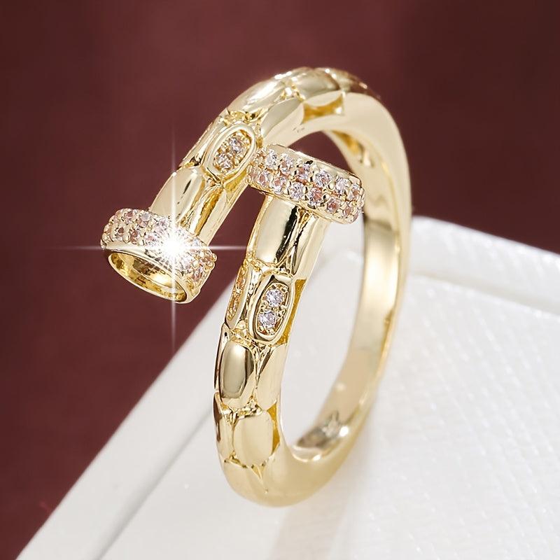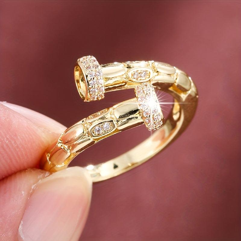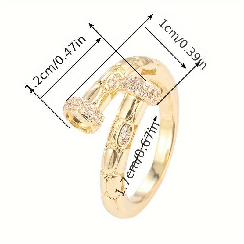 This elegant ring features a geometric openwork design in a minimalist style. It is plated in a beautiful golden color and accented with delicate details, making it perfect for both everyday wear and special occasions. This ring is adjustable to fit most finger sizes and would make a lovely gift for any woman.