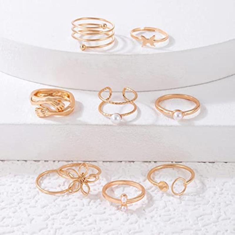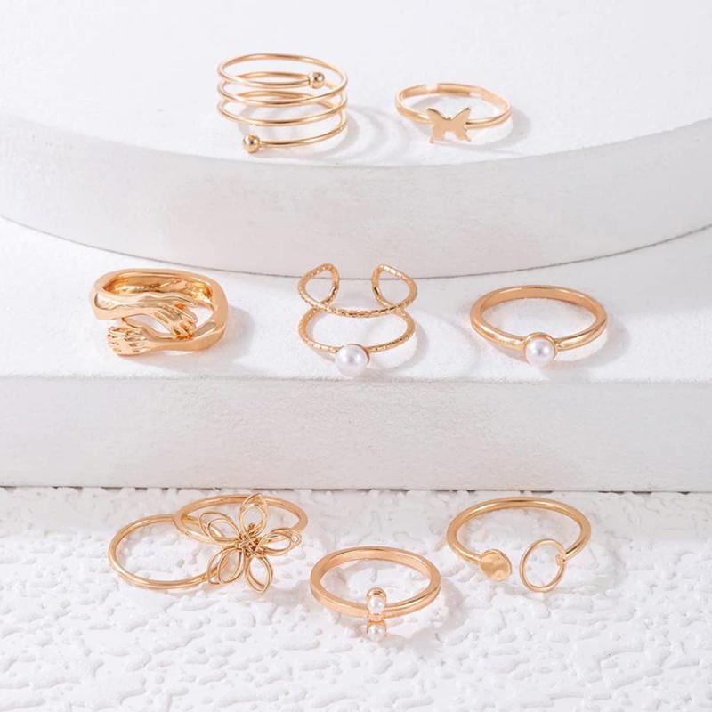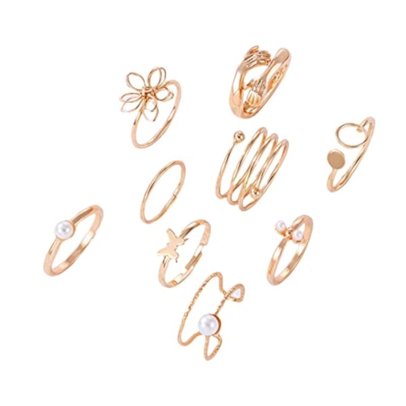 Add a touch of elegance to your outfit with this set of 9 plated adjustable hug-floral finger rings. Perfect for everyday wear or special occasions.