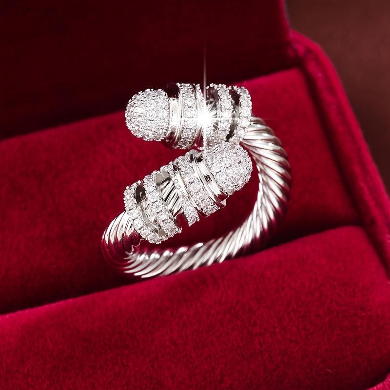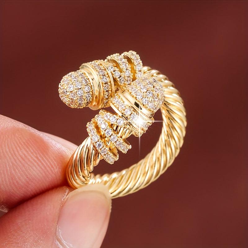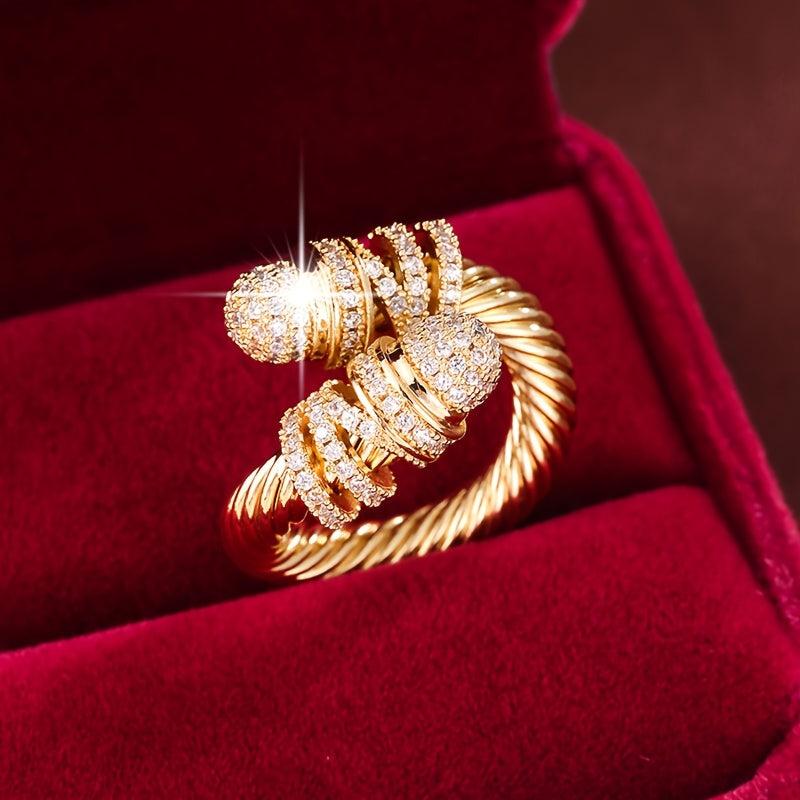 Elegant and versatile, this open ring features a geometric cross design with synthetic cubic zirconia stones. It is made of golden plated copper, perfect for parties, vacations, and year-round wear.
