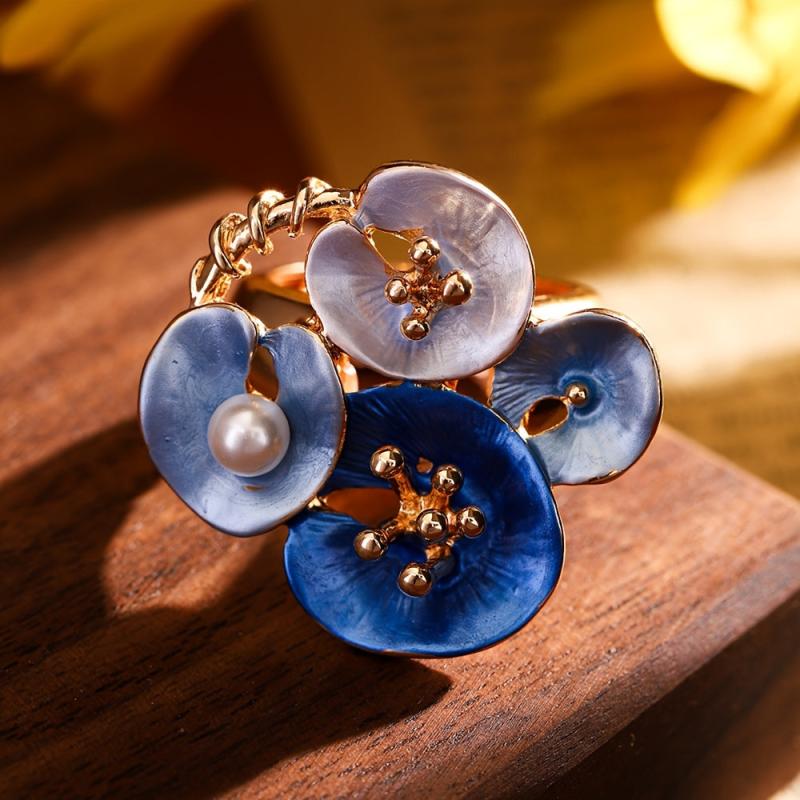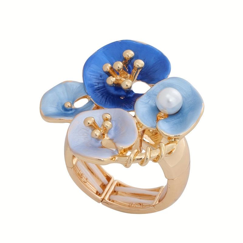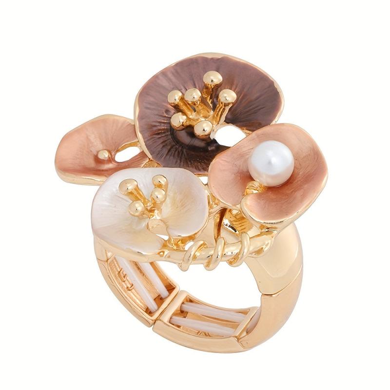 Adjustable Ring with Faux Pearl & Floral Inlay Golden Tone Floral