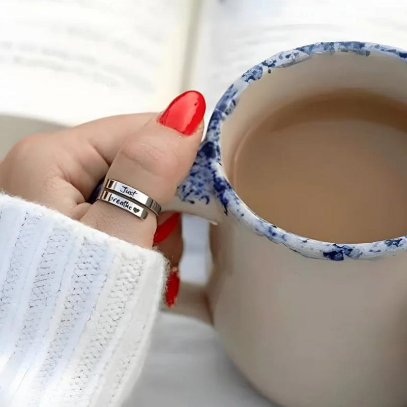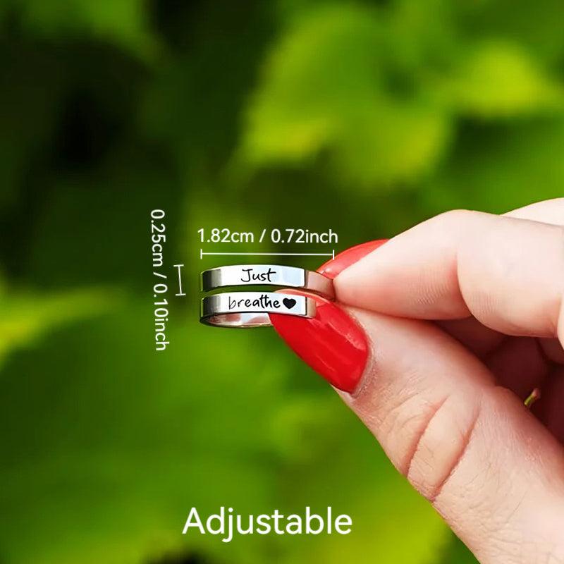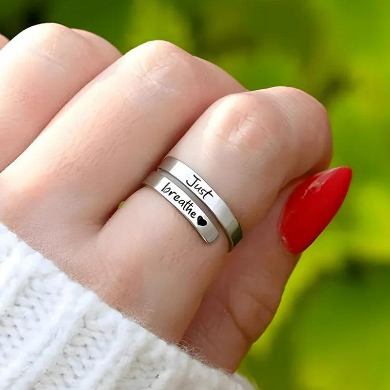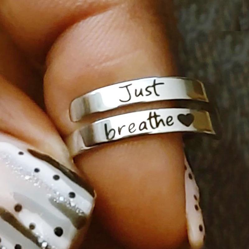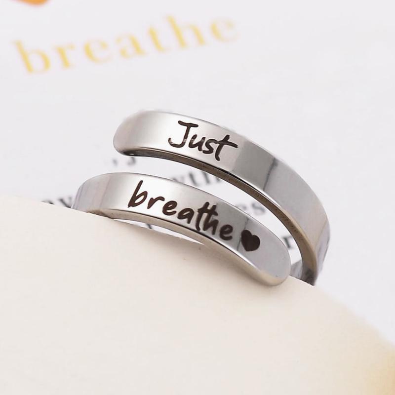 Elegant and versatile stainless steel cuff ring featuring a heart design with 'Just Breathe' engraving. Perfect for everyday wear and special occasions.