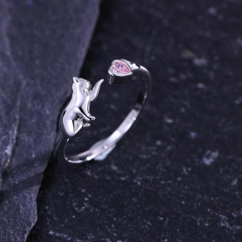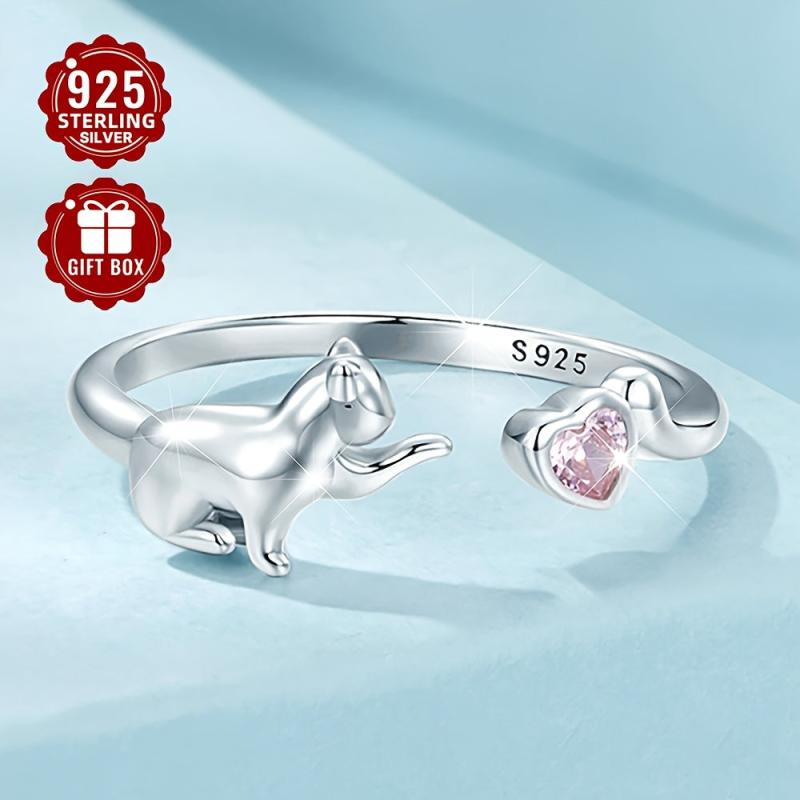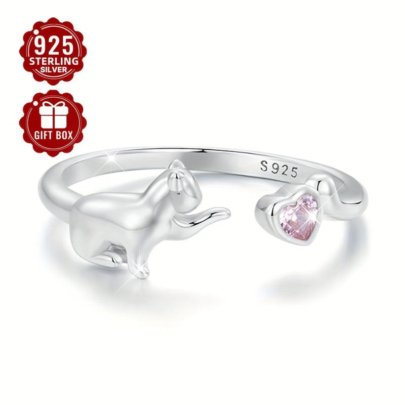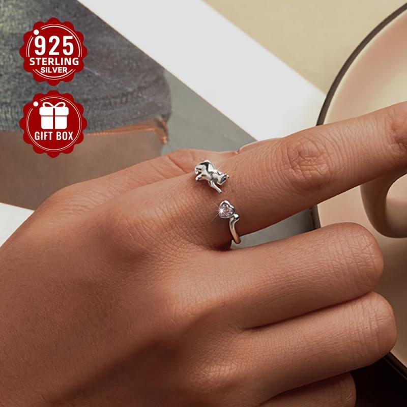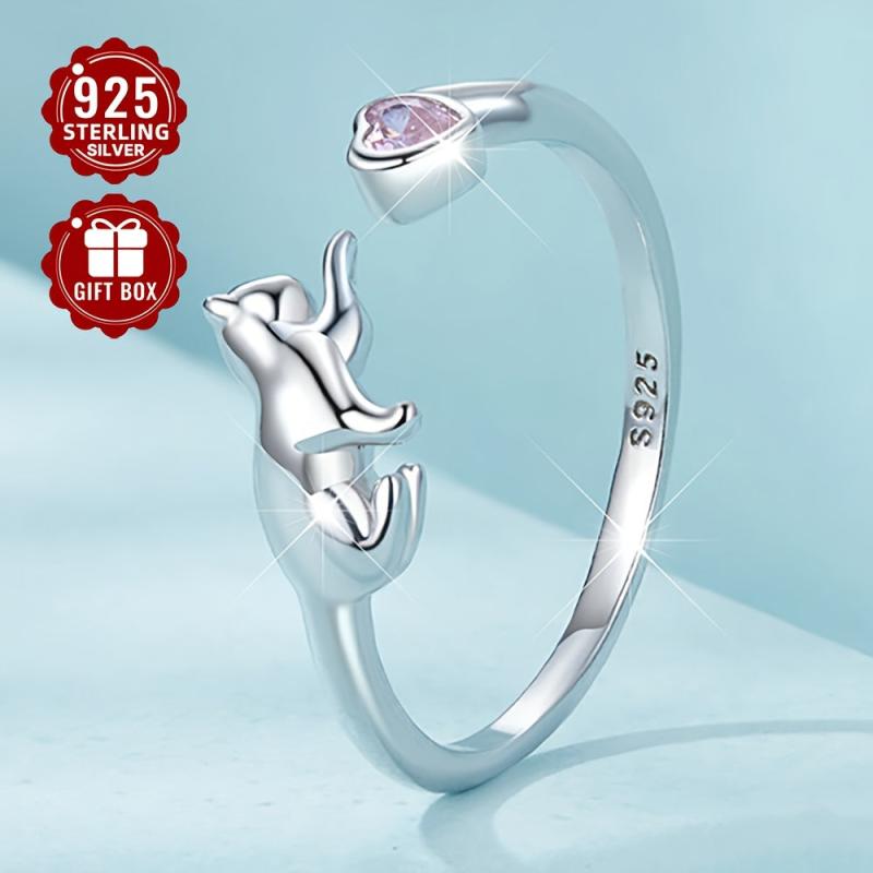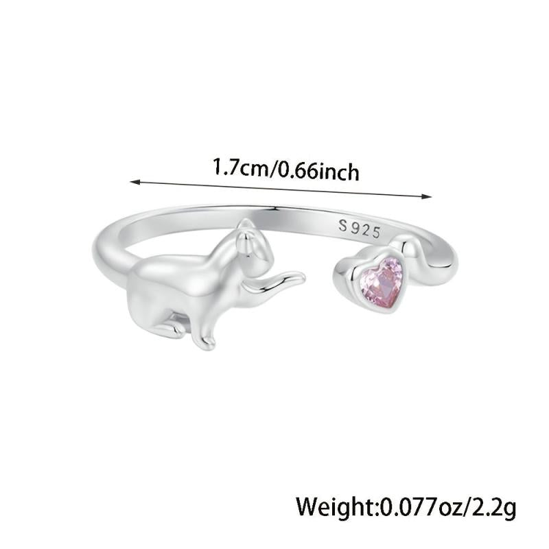 This adorable cat ring is made of S925 sterling silver and features a pink heart-shaped cubic zirconia. Perfect for parties or a playful touch to your outfit.