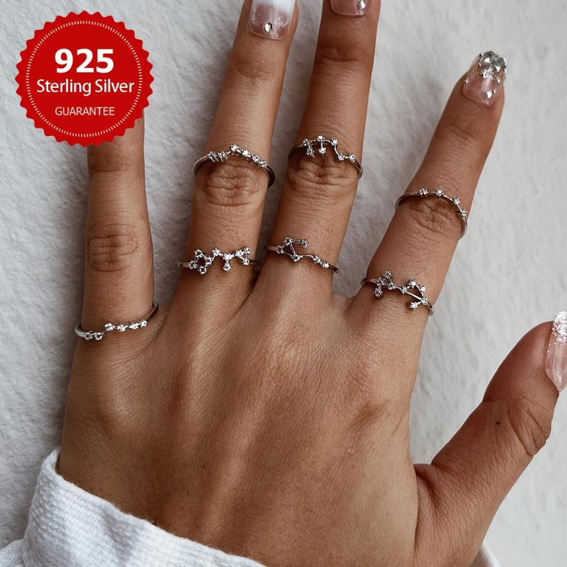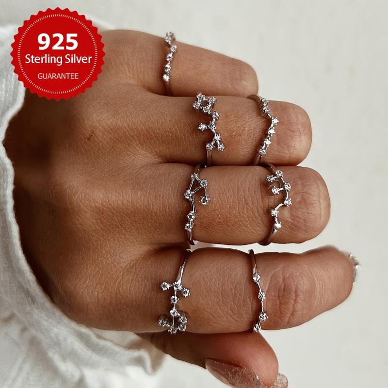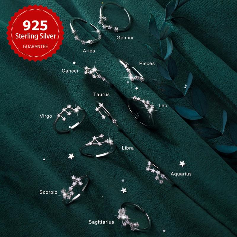 This elegant ring features the twelve zodiac signs on an adjustable open band. Made of s925 sterling silver, this ring is perfect for everyday wear or as a birthday gift.