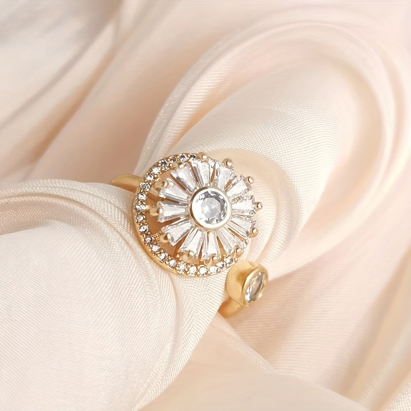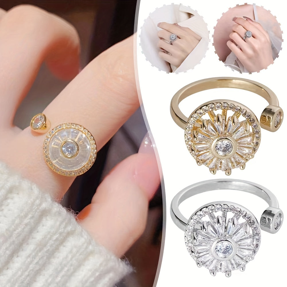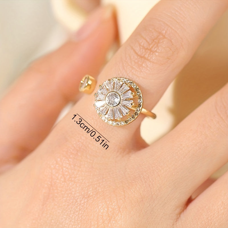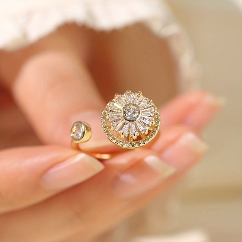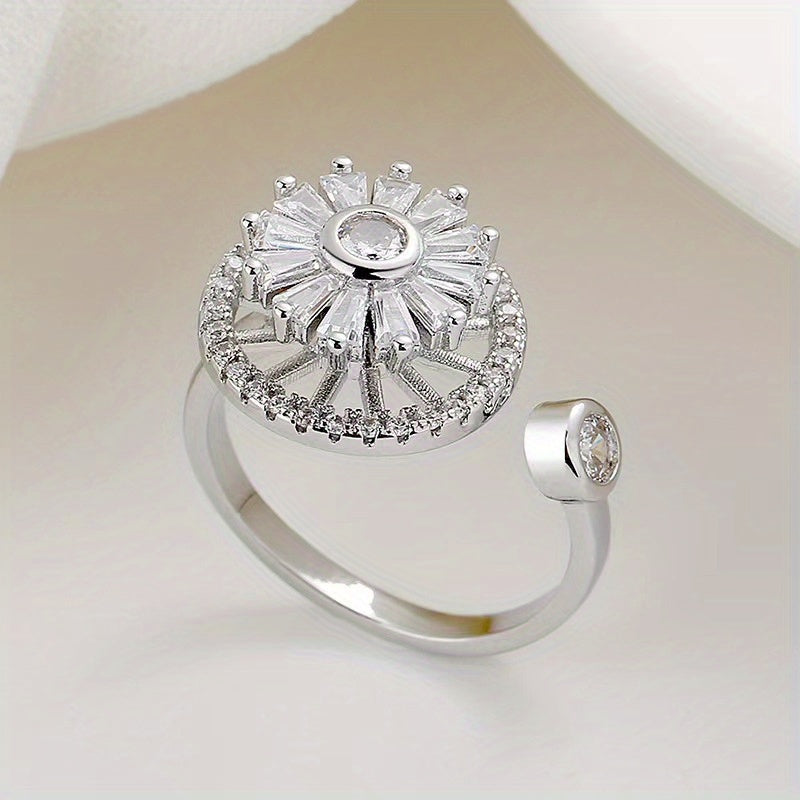 This unique ring features a spinning sunflower design with rhinestone inlays, perfect for stress relief and anxiety management. The adjustable band makes it suitable for various finger sizes.