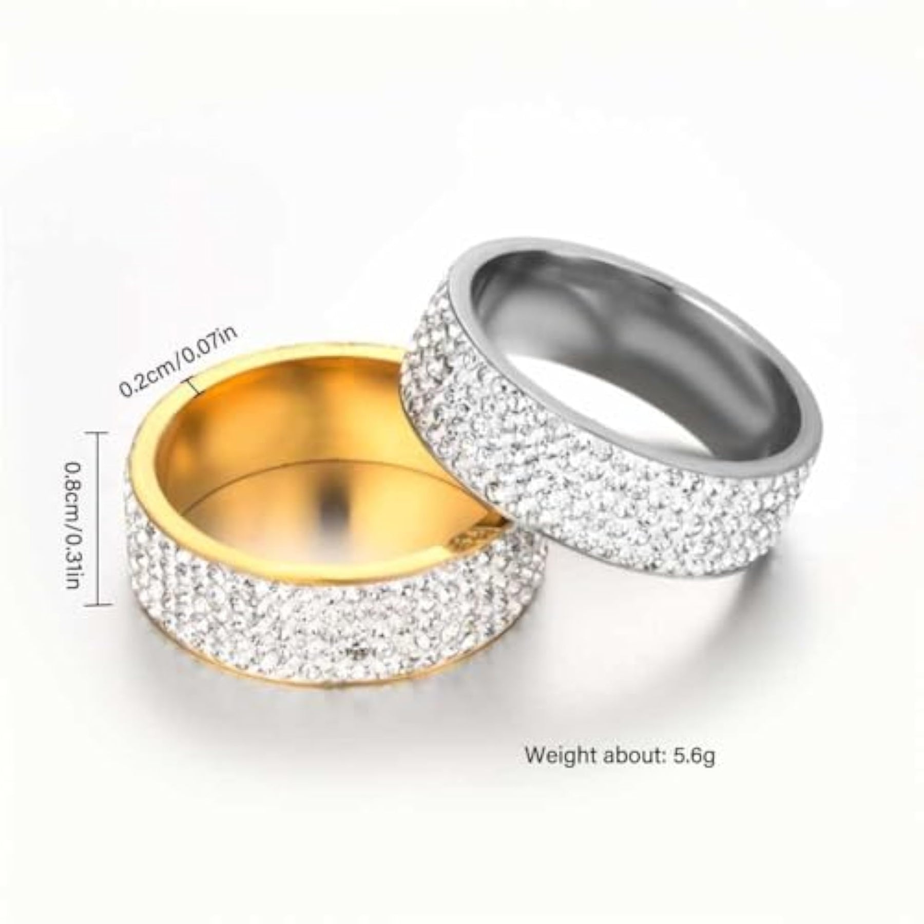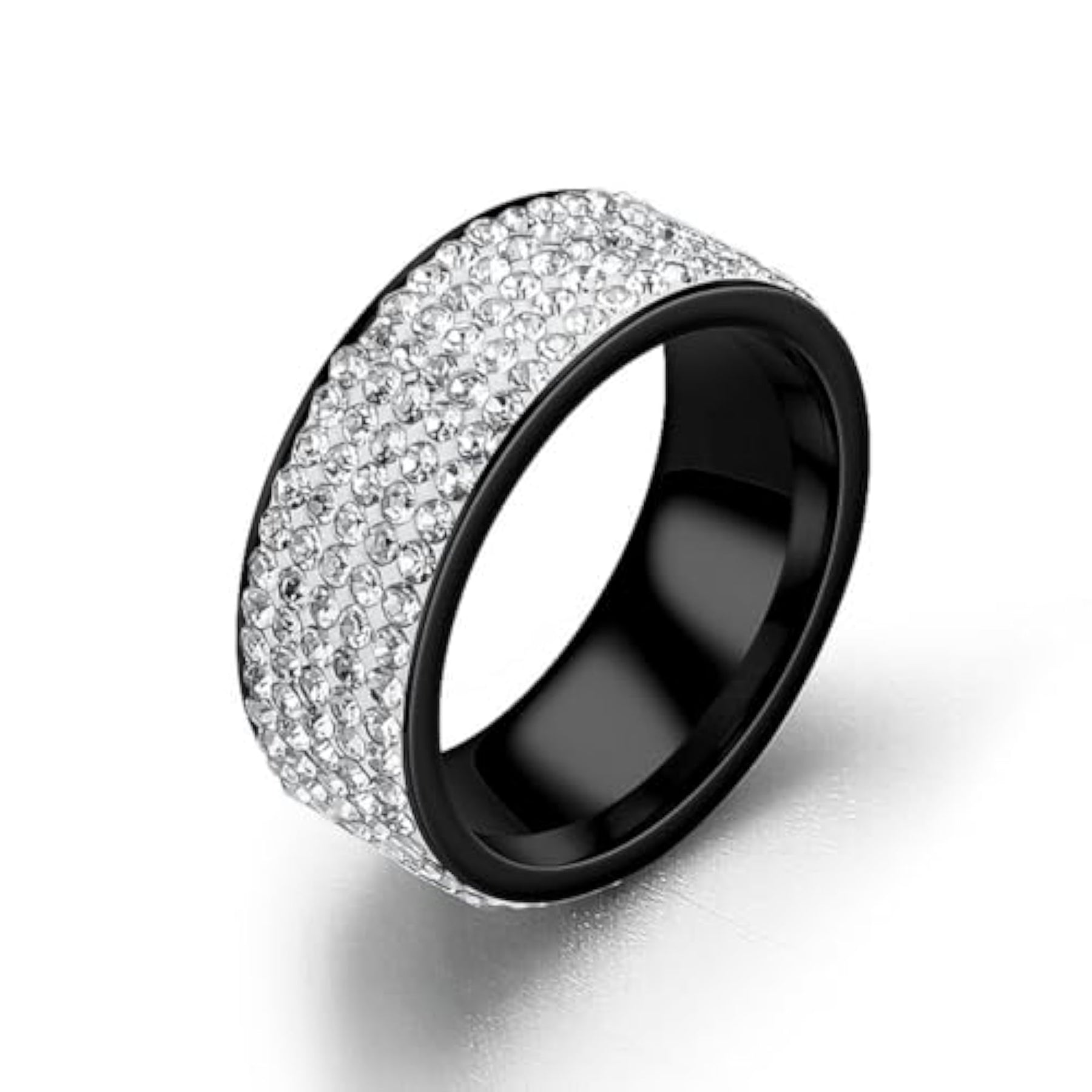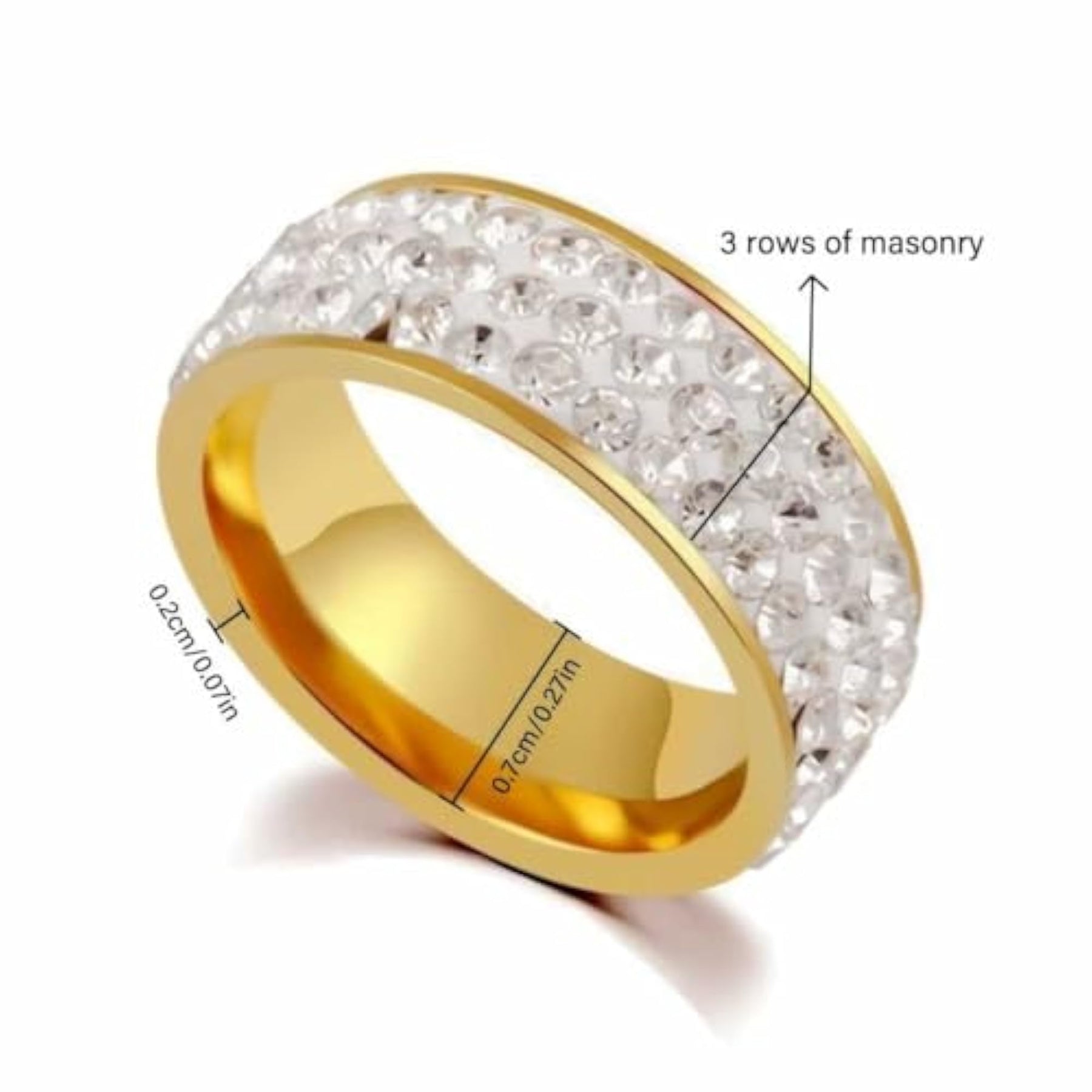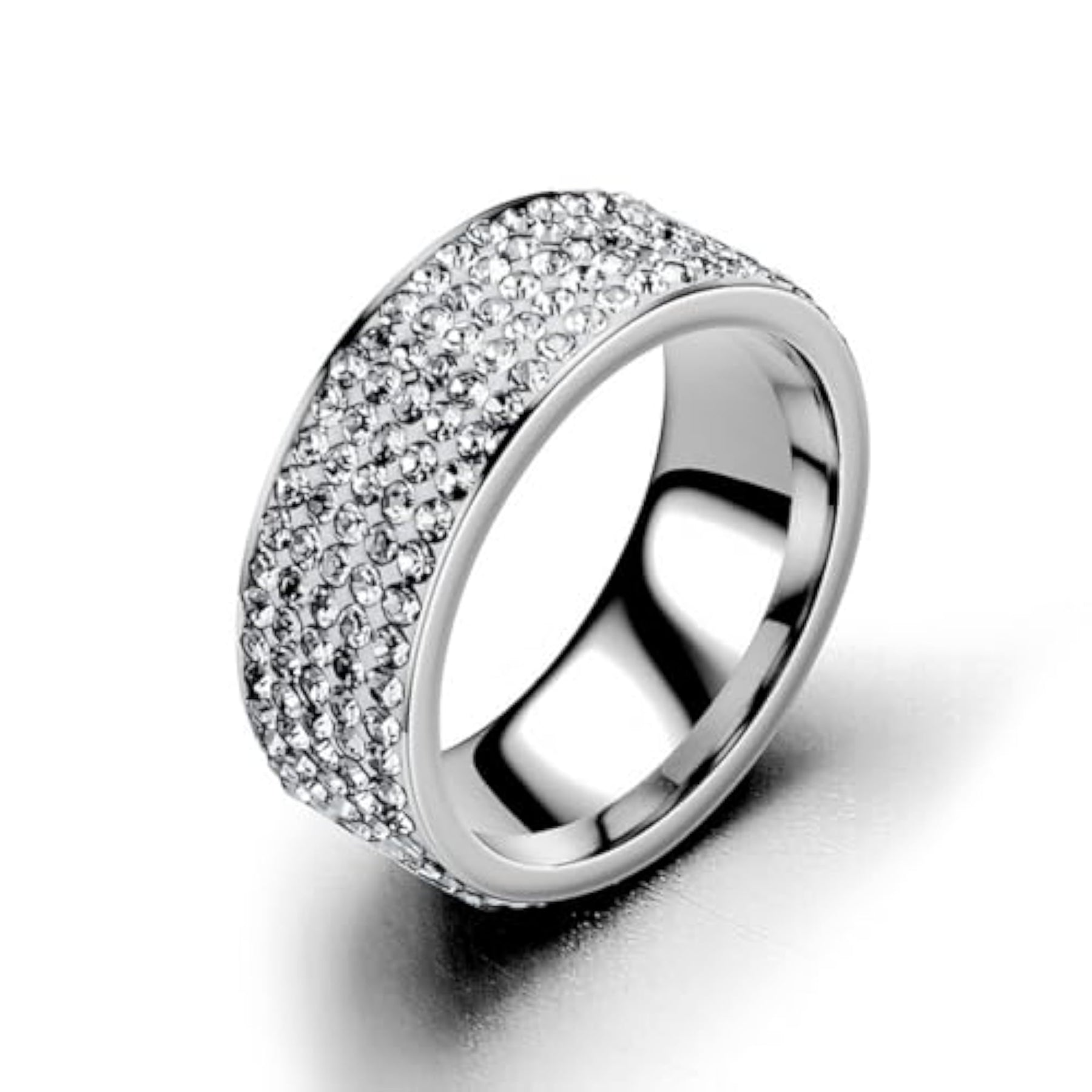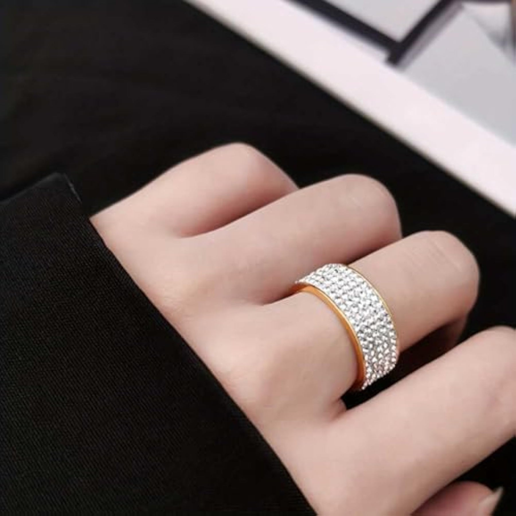Elegant wide band ring plated with sparkling cubic zirconia stones for a luxurious look.
