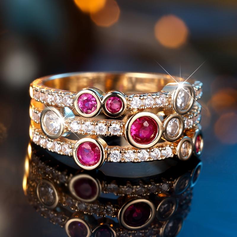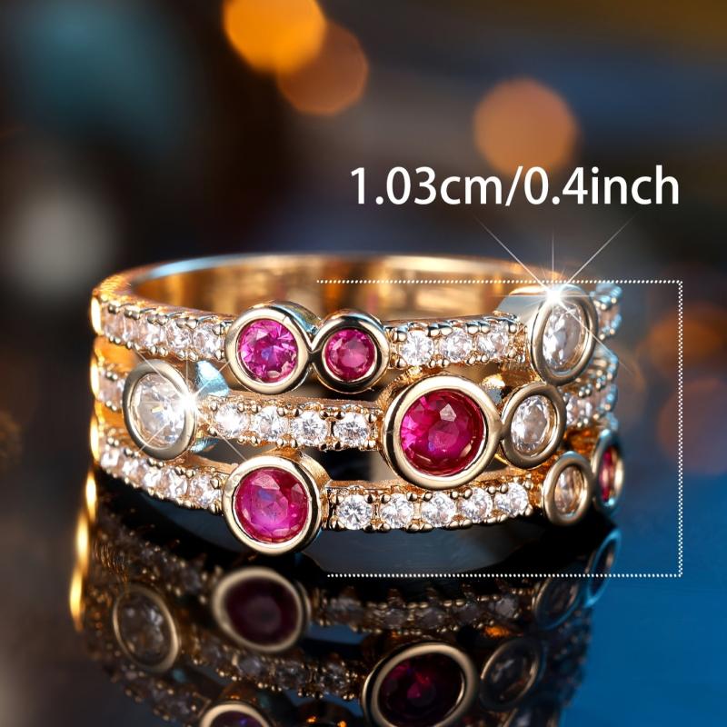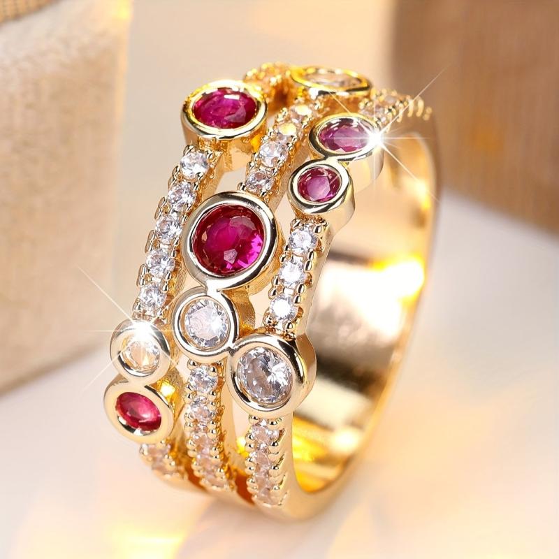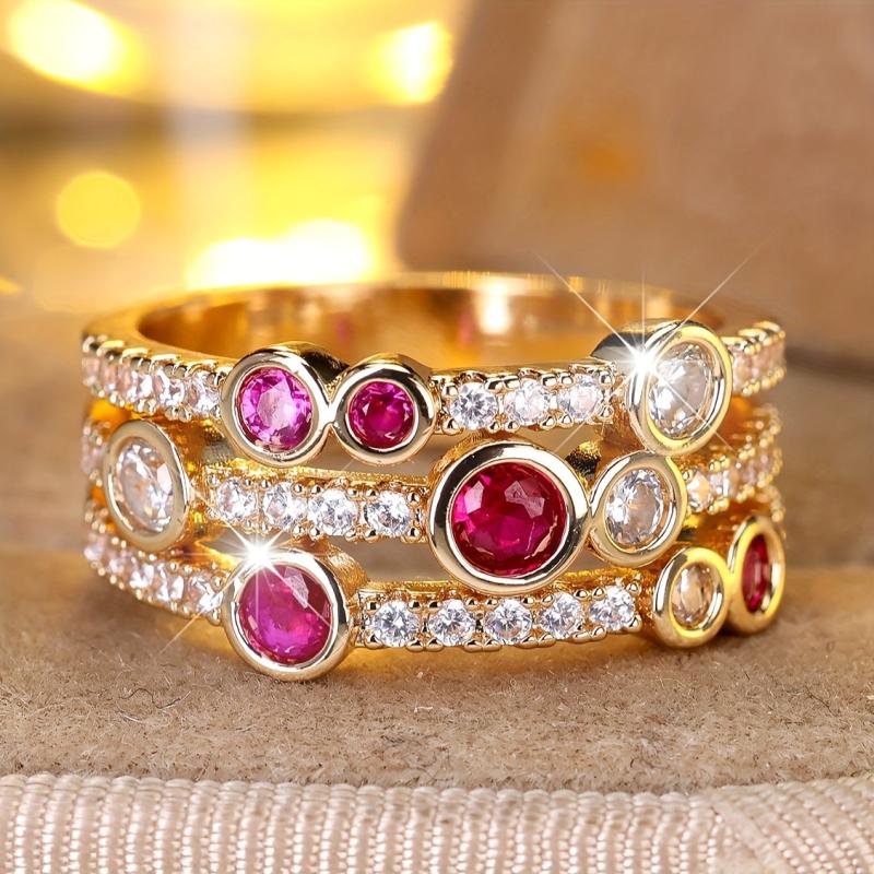 This Bohemian bubble ring features three rows of sparkling pink and clear gemstones on a KC gold-plated band. A perfect gift for Mother's Day!