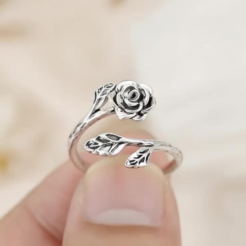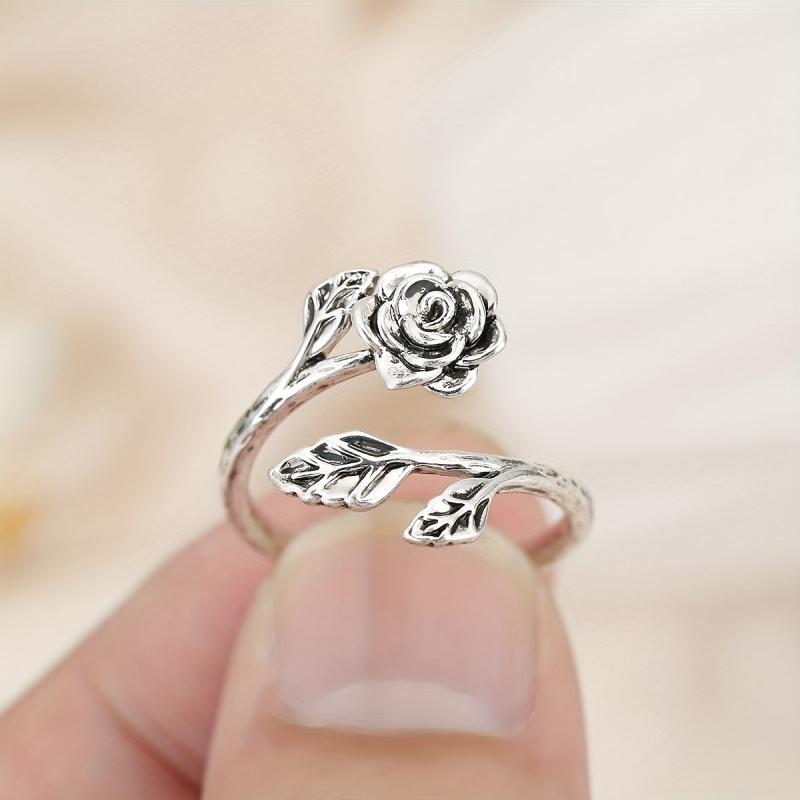 This stylish ring features an open rose design made of synthetic stones and copper. It is adjustable to fit most sizes and adds a touch of bohemian charm to any outfit.