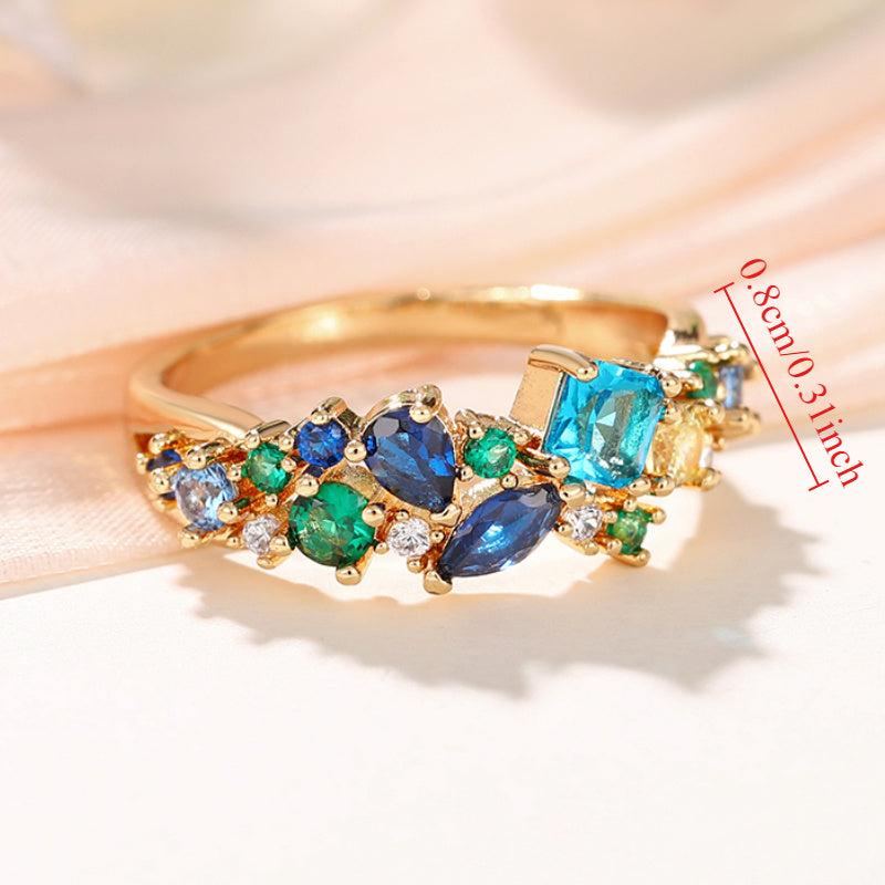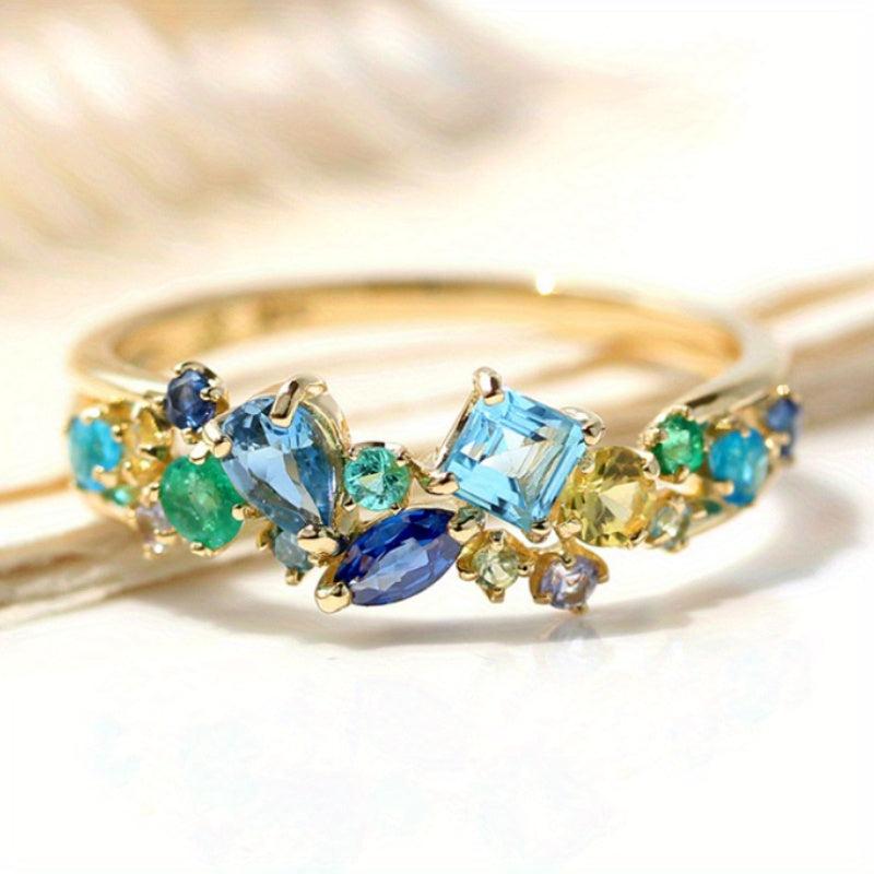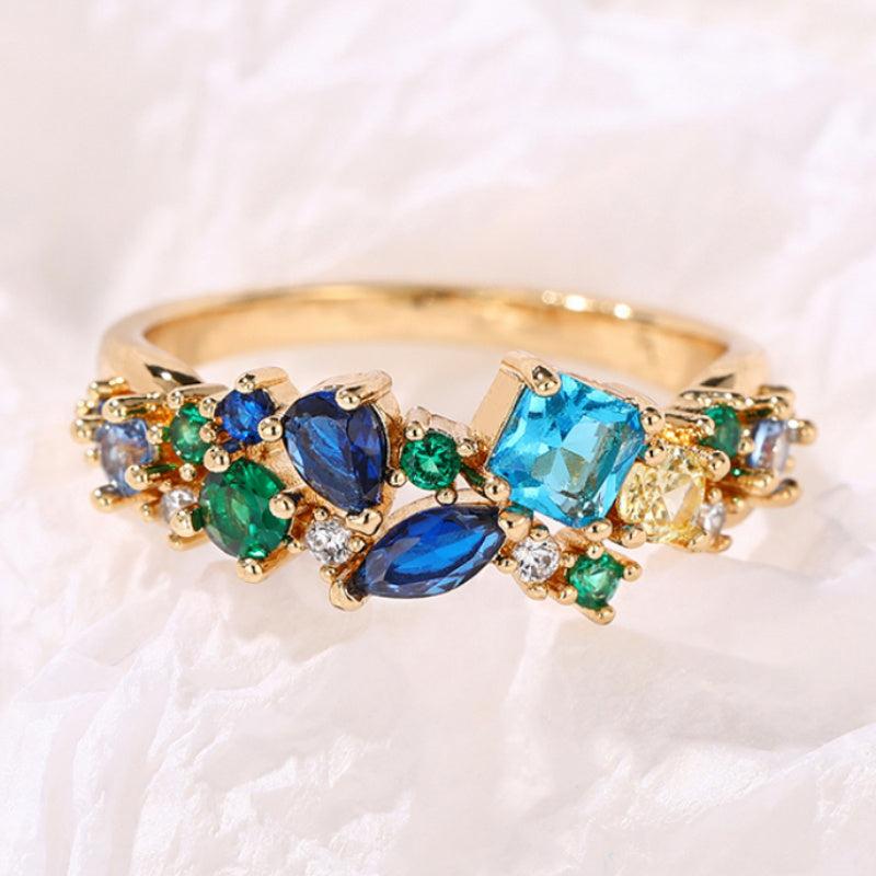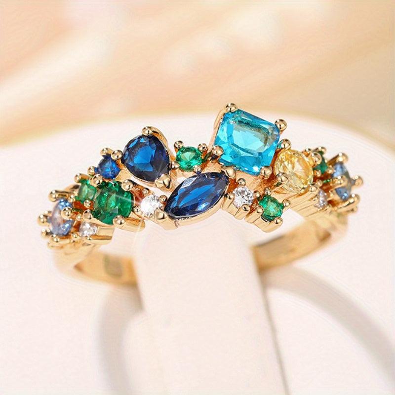 Add a touch of bohemian style to your look with this stunning ring featuring synthetic stones. Perfect for vacation, parties, or everyday wear. The ring is plated with KC gold and showcases irregularly cut gemstones that sparkle beautifully.