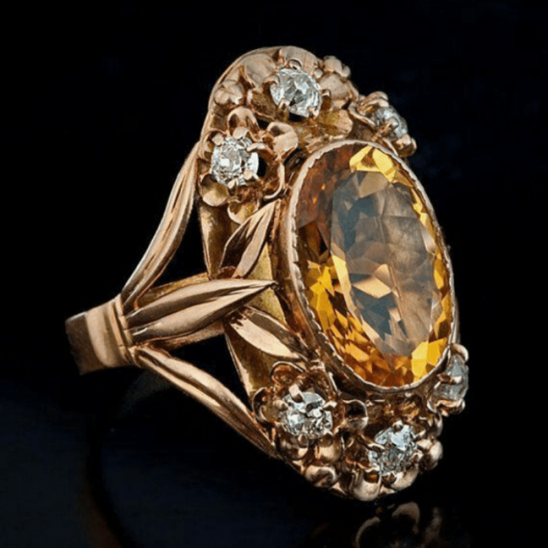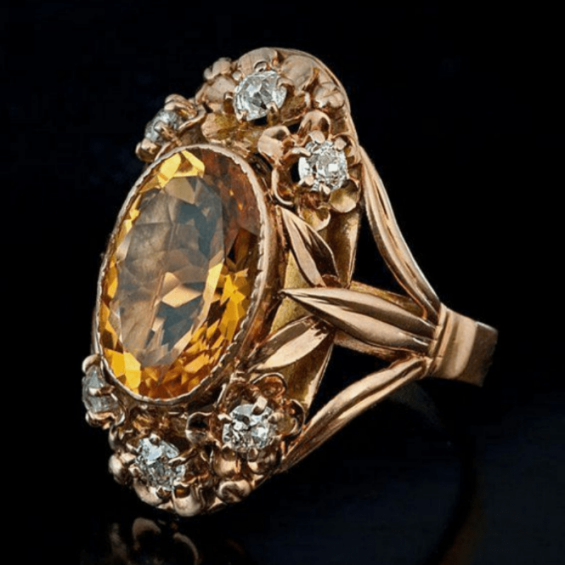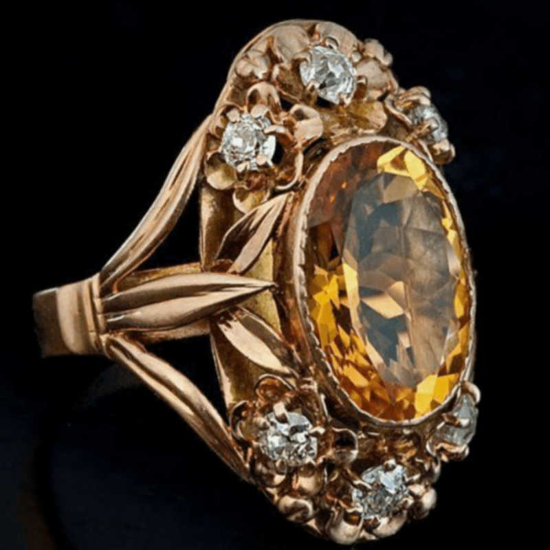 Add a touch of vintage elegance with this 14K golden plated ring featuring yellow cubic zirconia and sparkling crystals. Perfect for weddings and anniversaries.