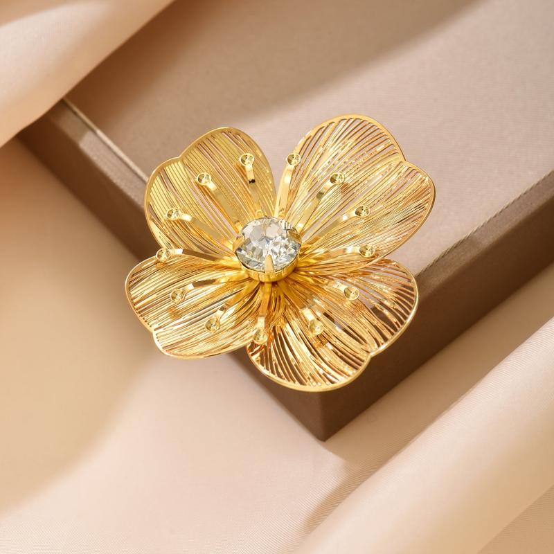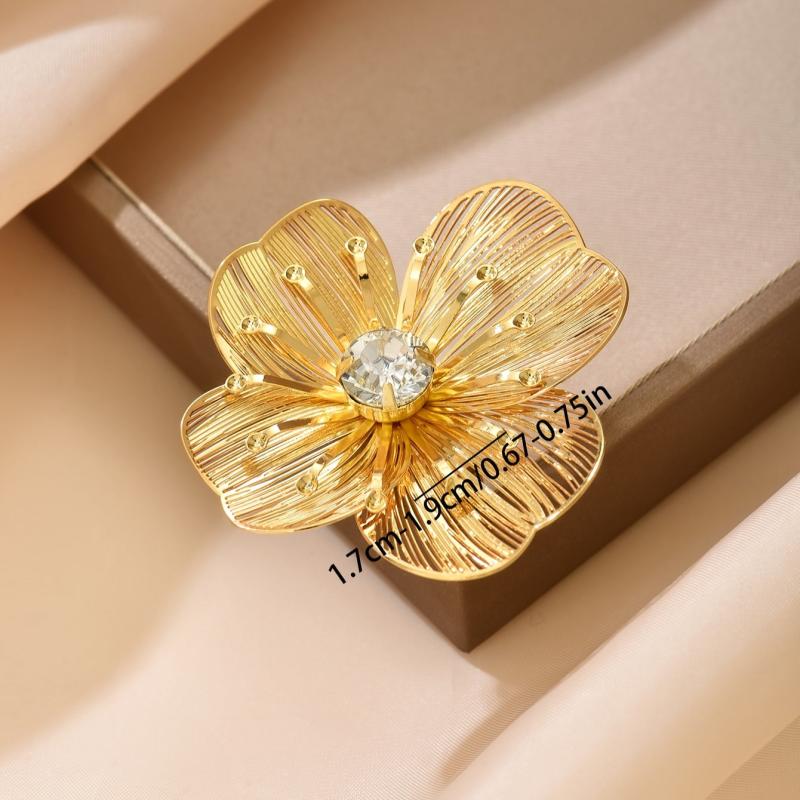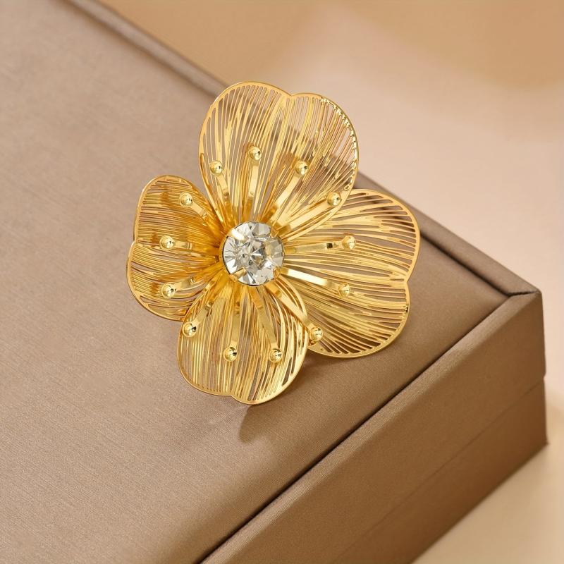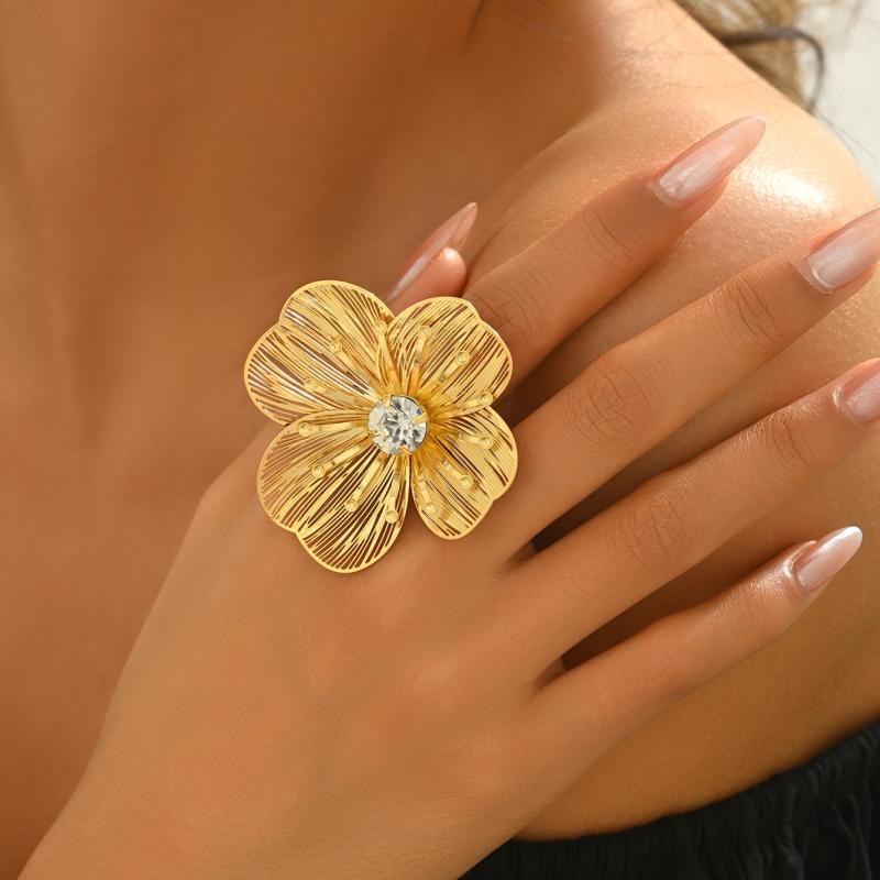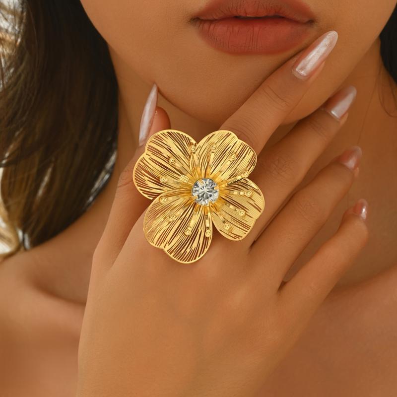 This Boho flower ring features a stunning design with rhinestone inlay, 18K golden plated finish, and iron resin mosaic. It is adjustable and versatile, perfect for daily wear or as a gift for special occasions.