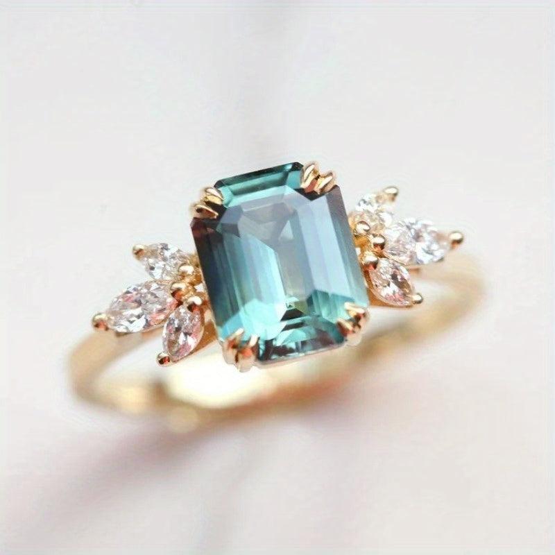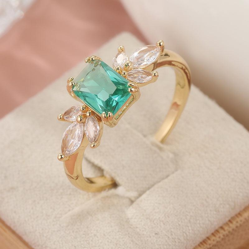 This elegant leaf ring features a synthetic emerald stone surrounded by cubic zirconia crystals. Perfect for weddings or vacations, this nature-inspired piece is a thoughtful gift for her.