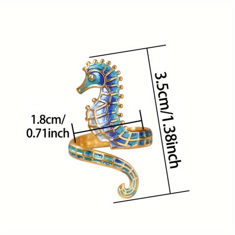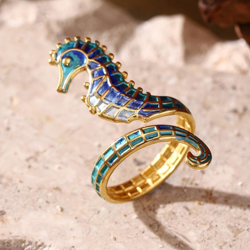 Add a touch of Bohemian charm to your outfit with this colorful seahorse ring. Featuring vibrant and green enamel tiles, this nautical-themed accessory is perfect for everyday wear in the spring and summer seasons.