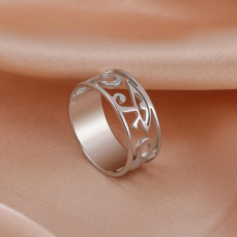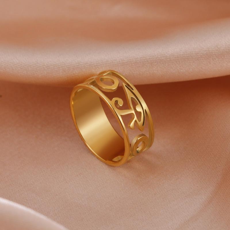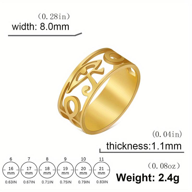 This stainless steel ring features a boho design with Horus Eye and Ankh Cross symbols. A unique piece of Egyptian-inspired jewelry suitable for both men and women.