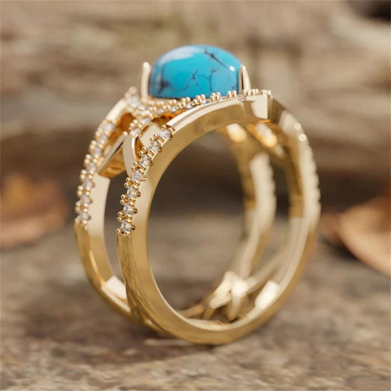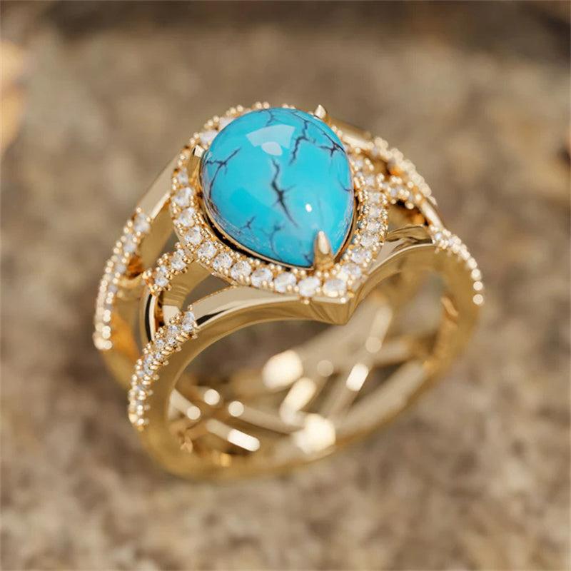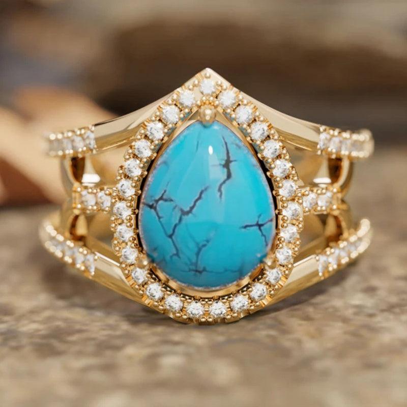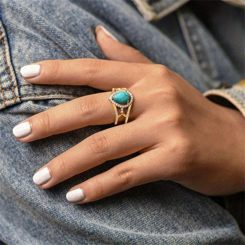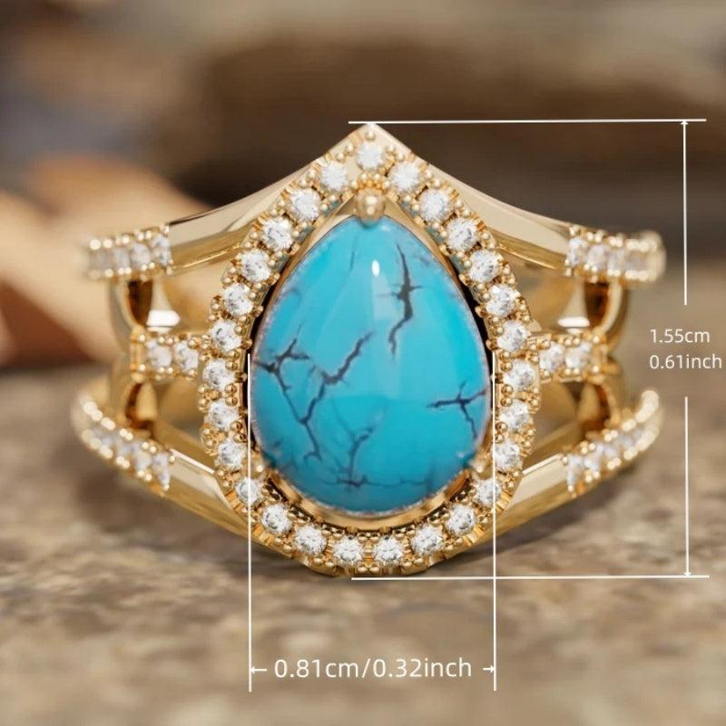 This bohemian style ring features a teardrop turquoise stone with golden tone sparkling accents, making it perfect for both casual parties and formal events. Add a touch of festive flair to your jewelry collection with this unique piece.