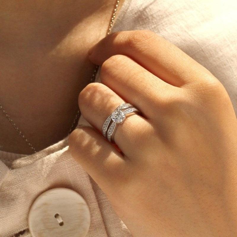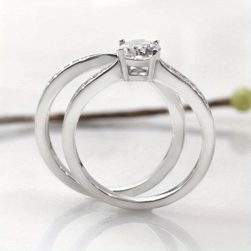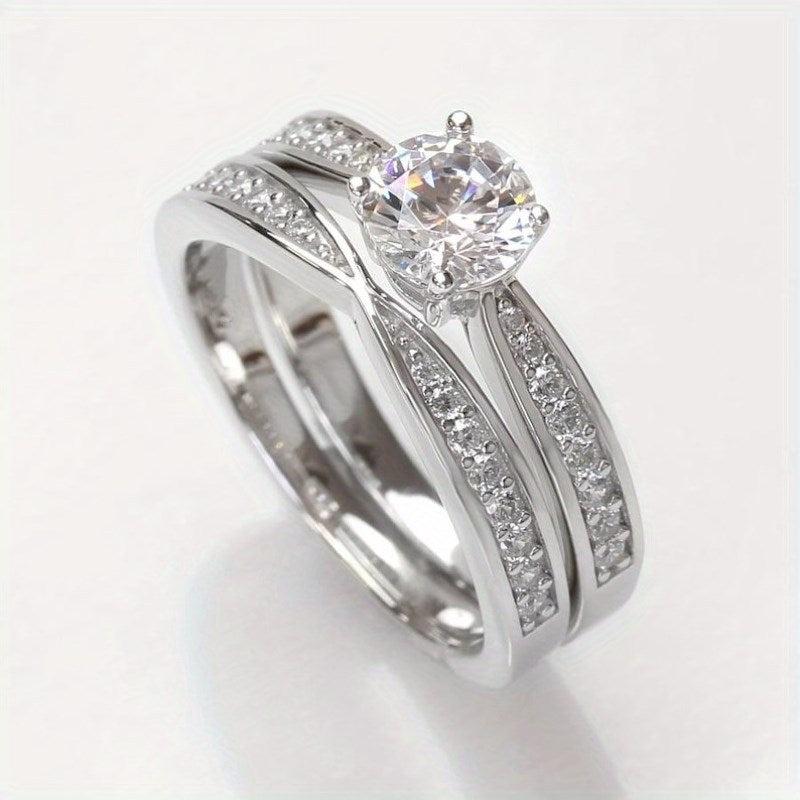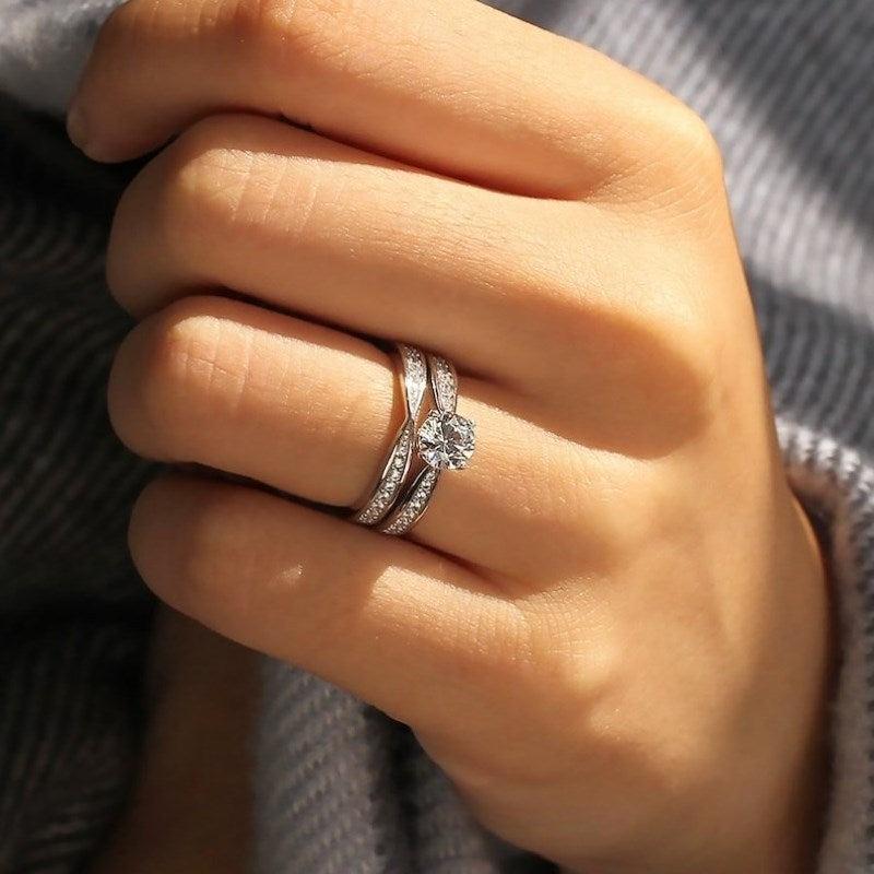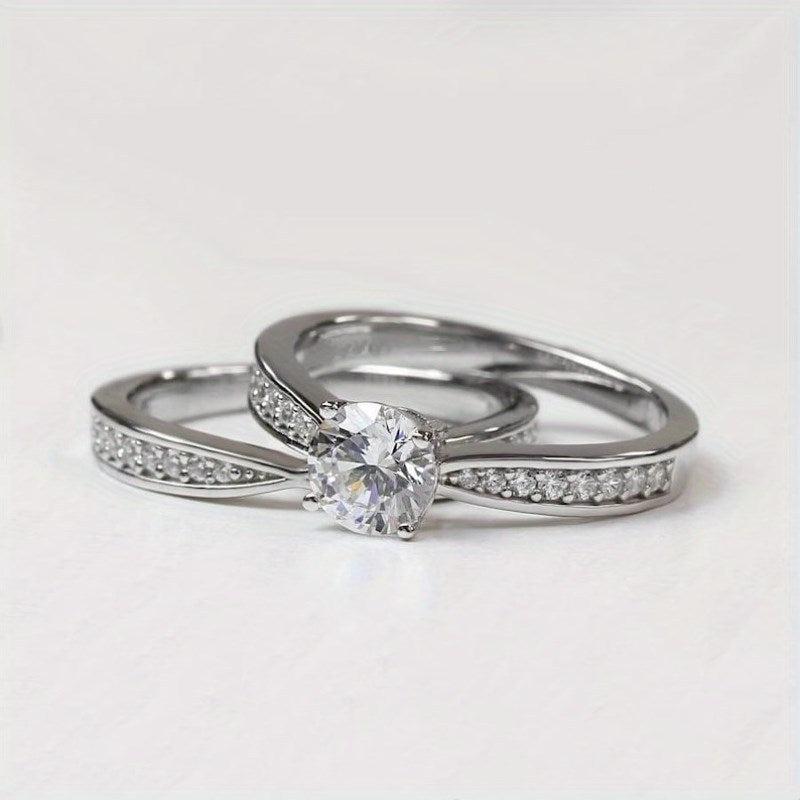 This bridal ring set features classic pinched shank rings with zirconia stones. Perfect for weddings or as a gift for your loved one.