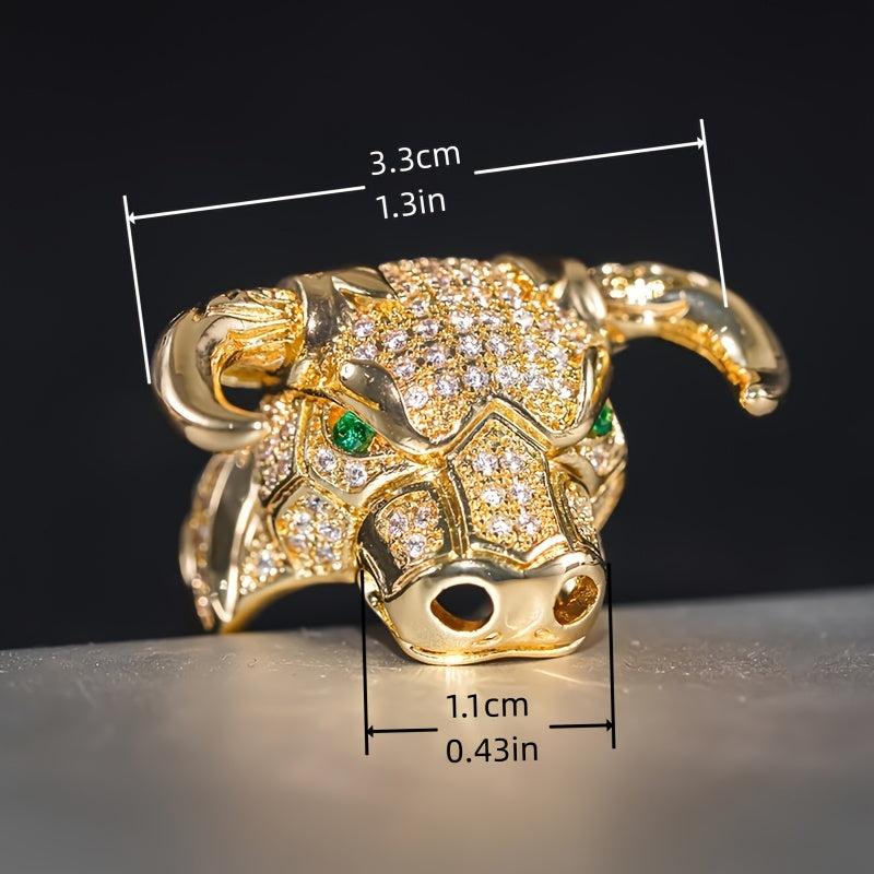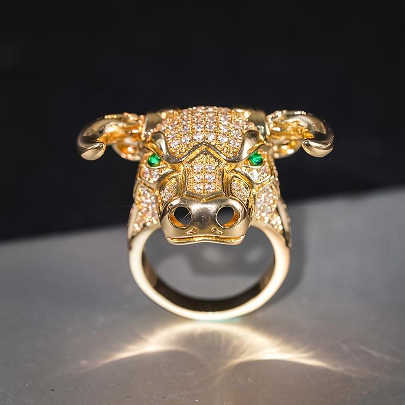 A bold ring featuring a bull head set with sparkling zirconia stones. Suitable for parties.