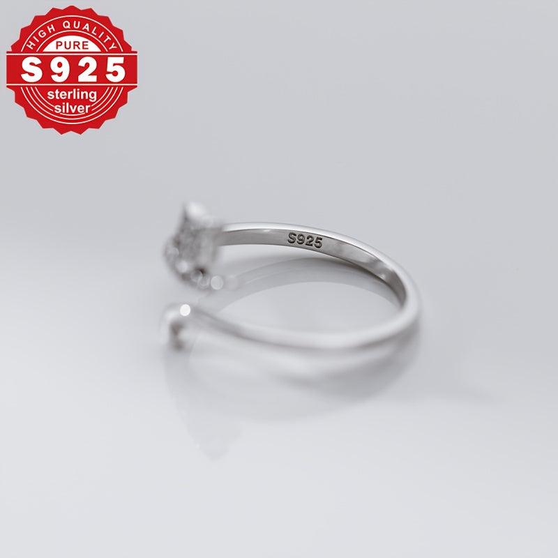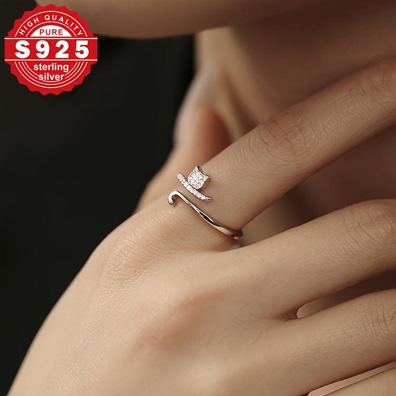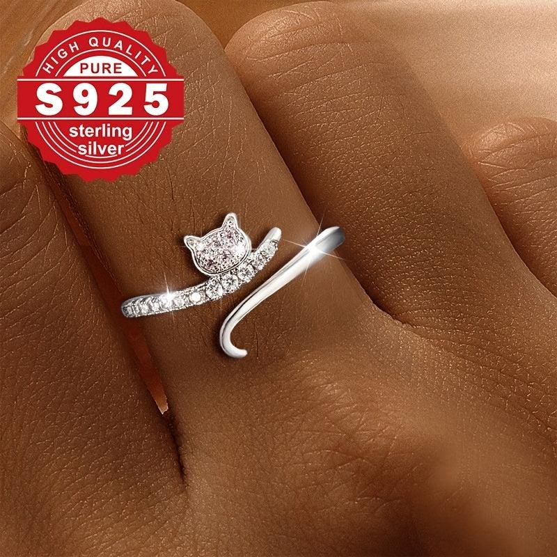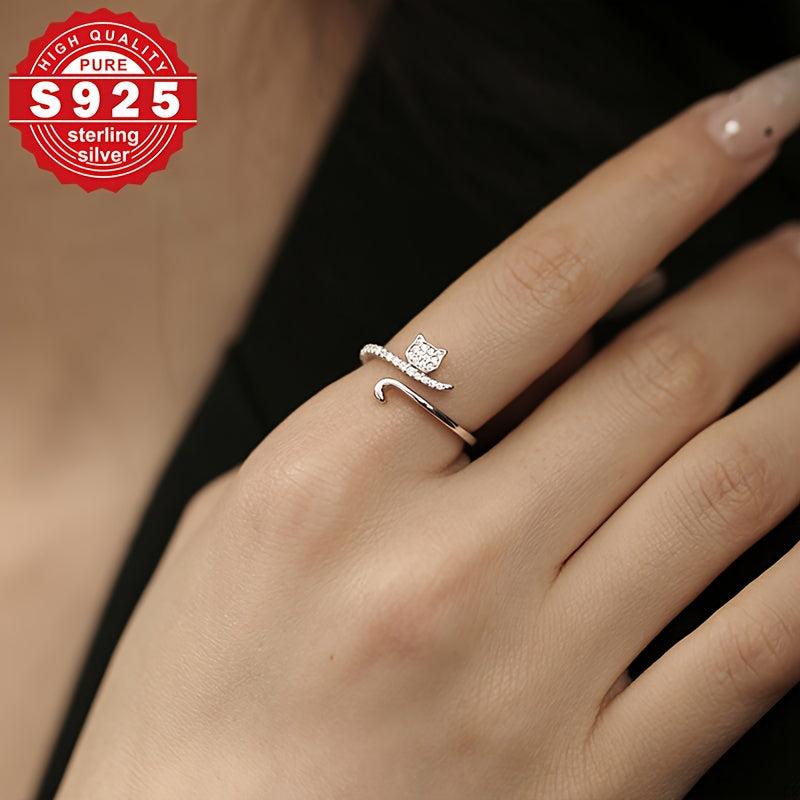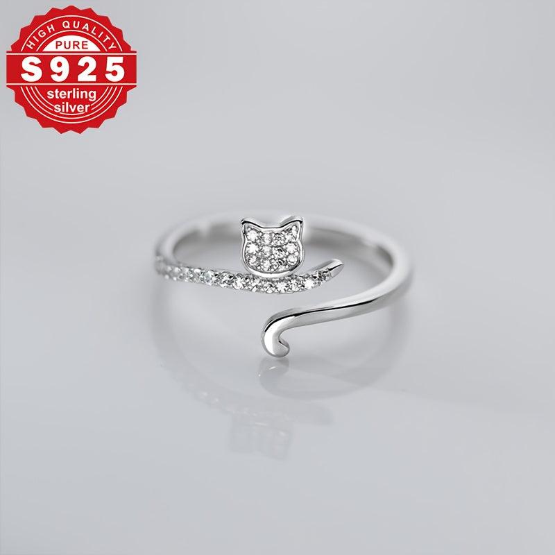 Adorable set of cat-shaped earrings and ring made of S925 sterling silver with cubic zirconia. Ideal for music festivals, parties, and festive occasions. A whimsical accessory that is perfect for cat lovers.