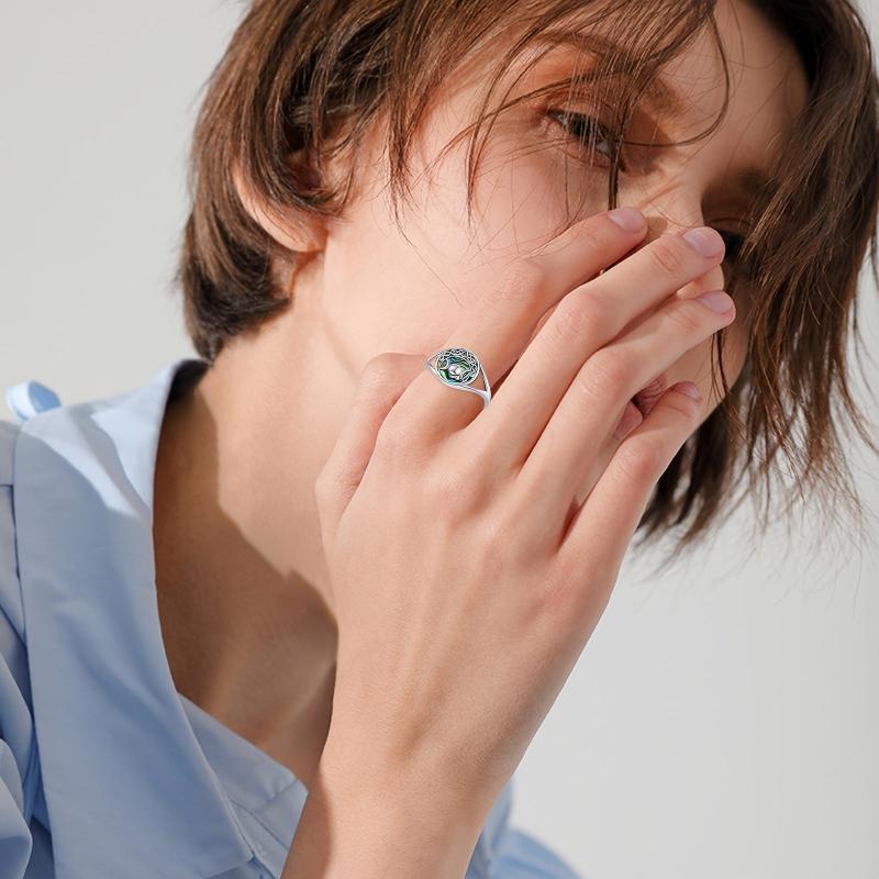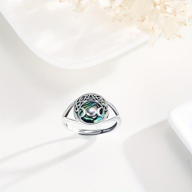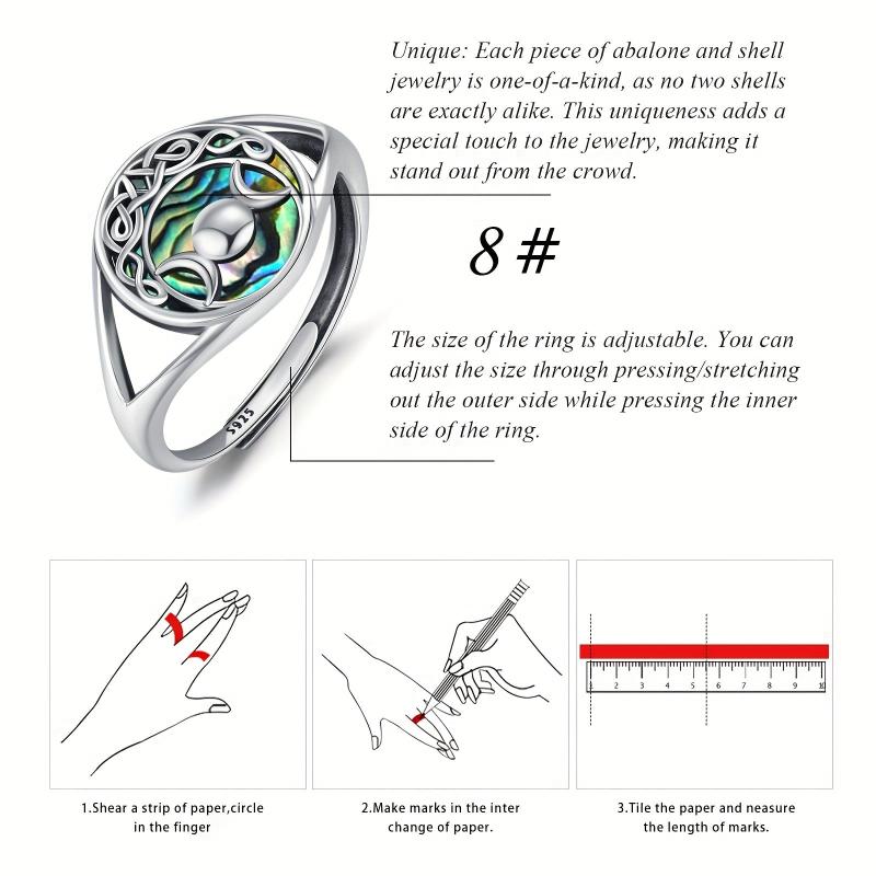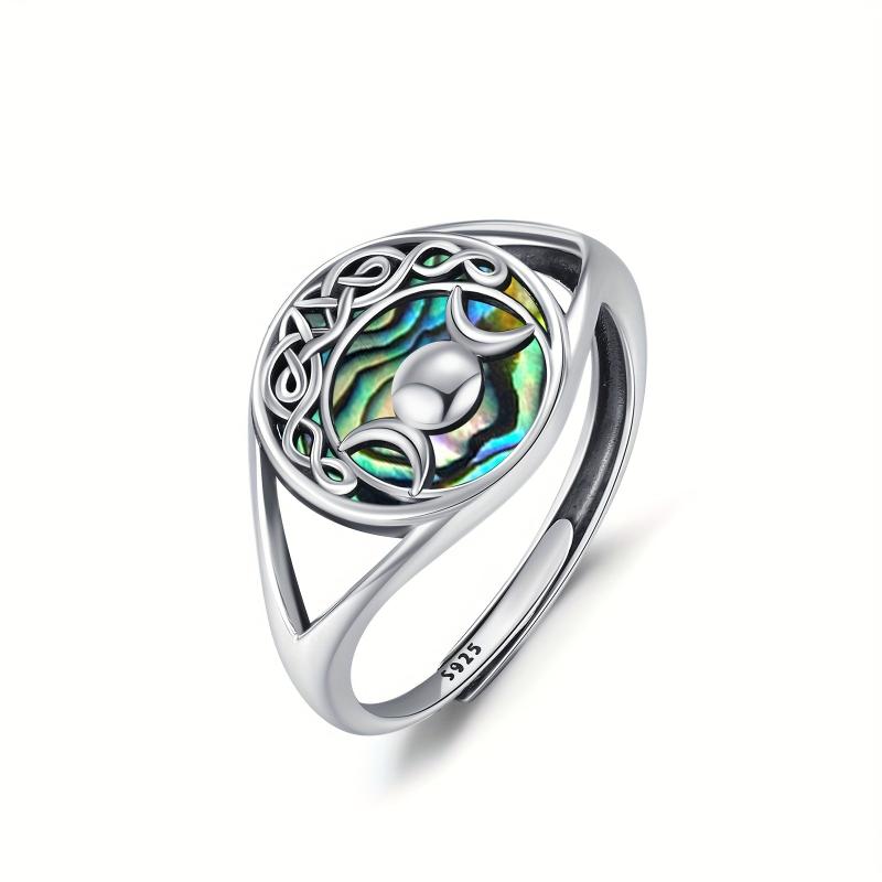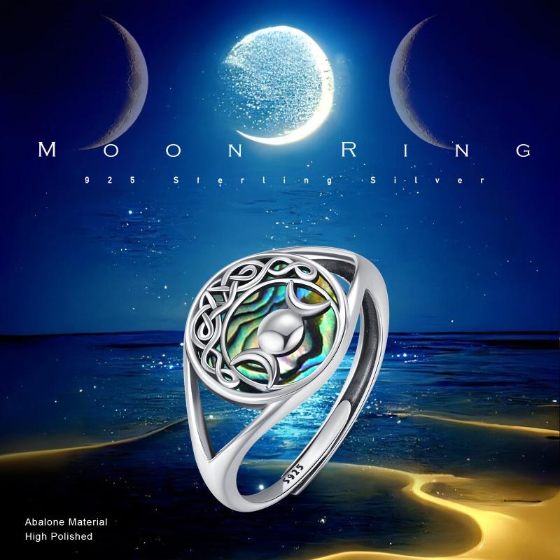 This Celtic ring features a triple moon design with abalone shell inlay, made of 925 sterling silver. It's an adjustable amulet ring, perfect as Celtic Wiccan jewelry gift for women, girlfriend, boyfriend, men, or bi individuals.