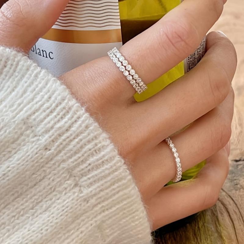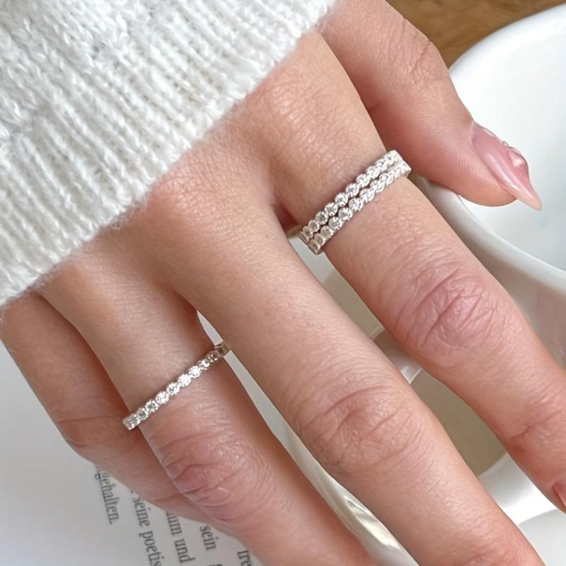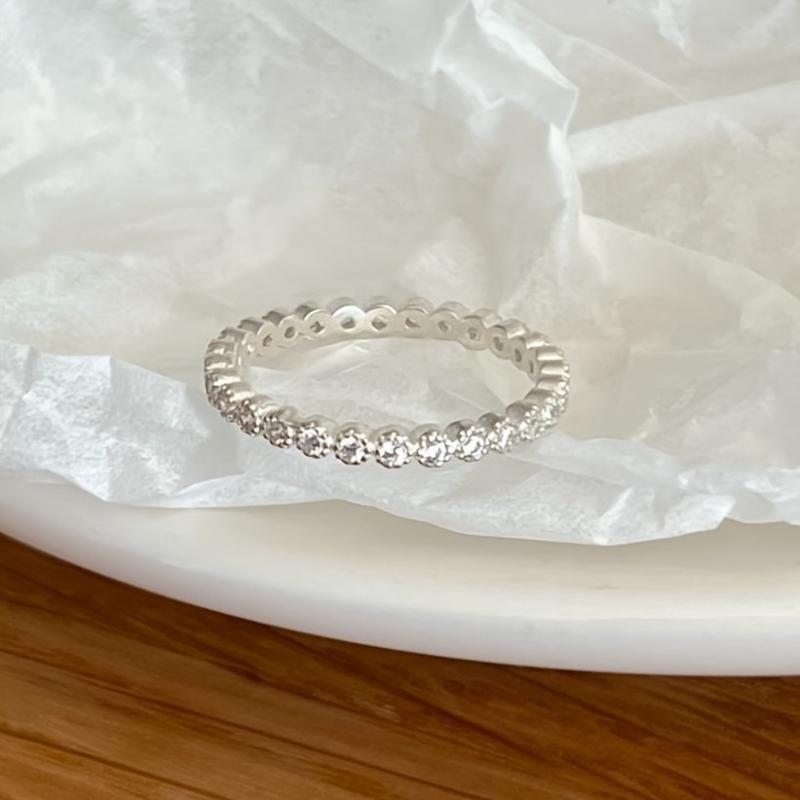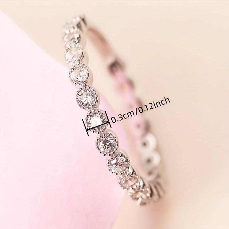 This elegant eternity ring features a single row of full circle synthetic zirconia, perfect for weddings or casual wear. Stackable design adds versatility.