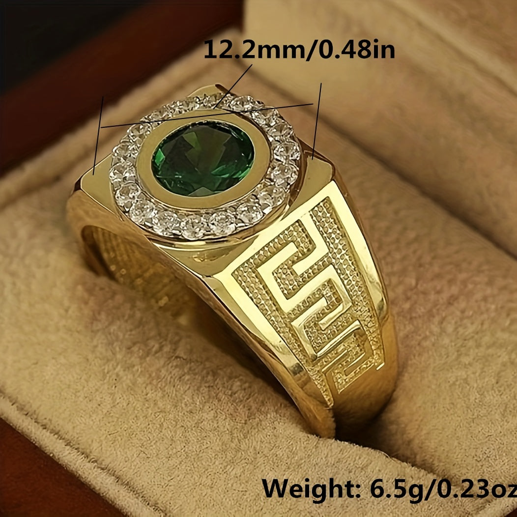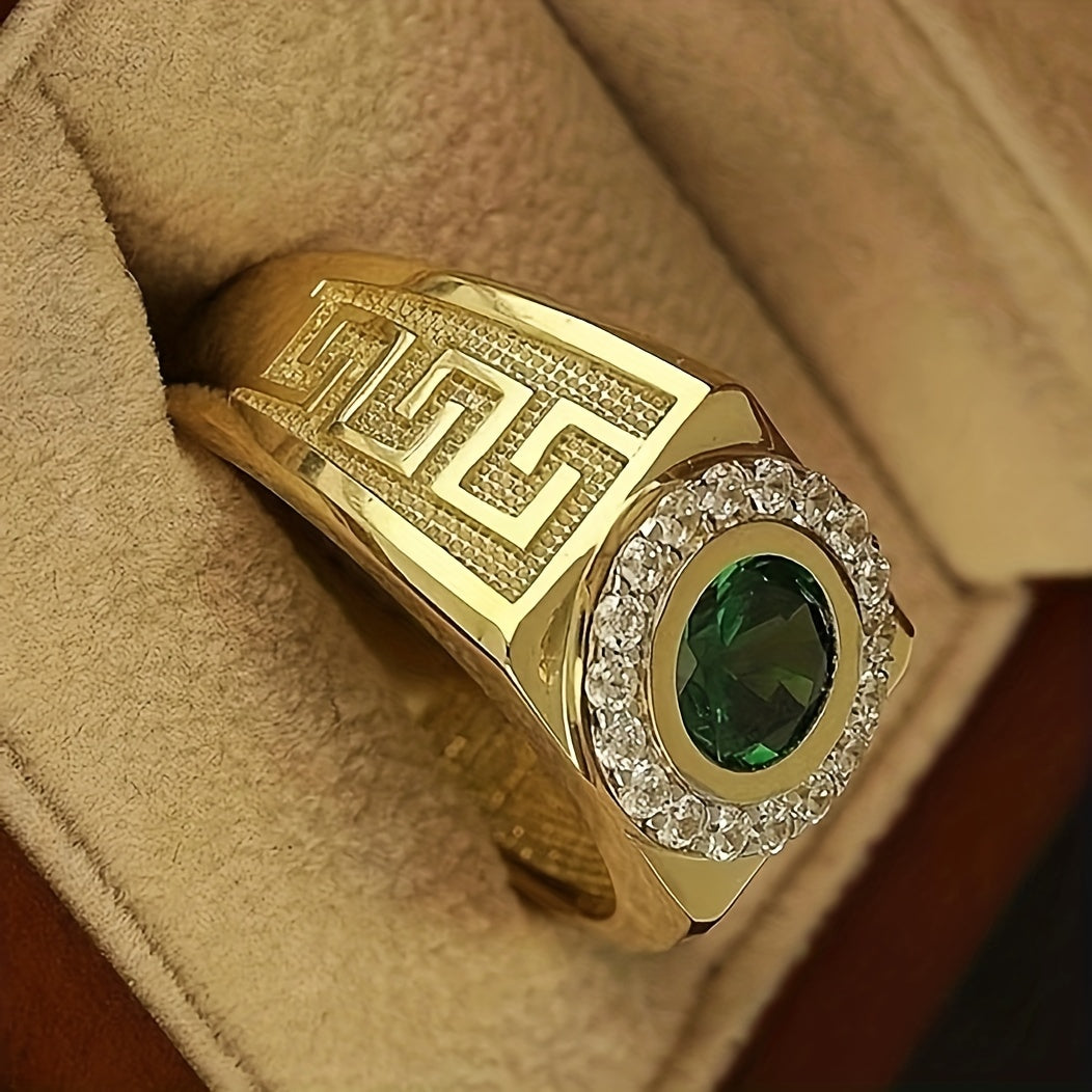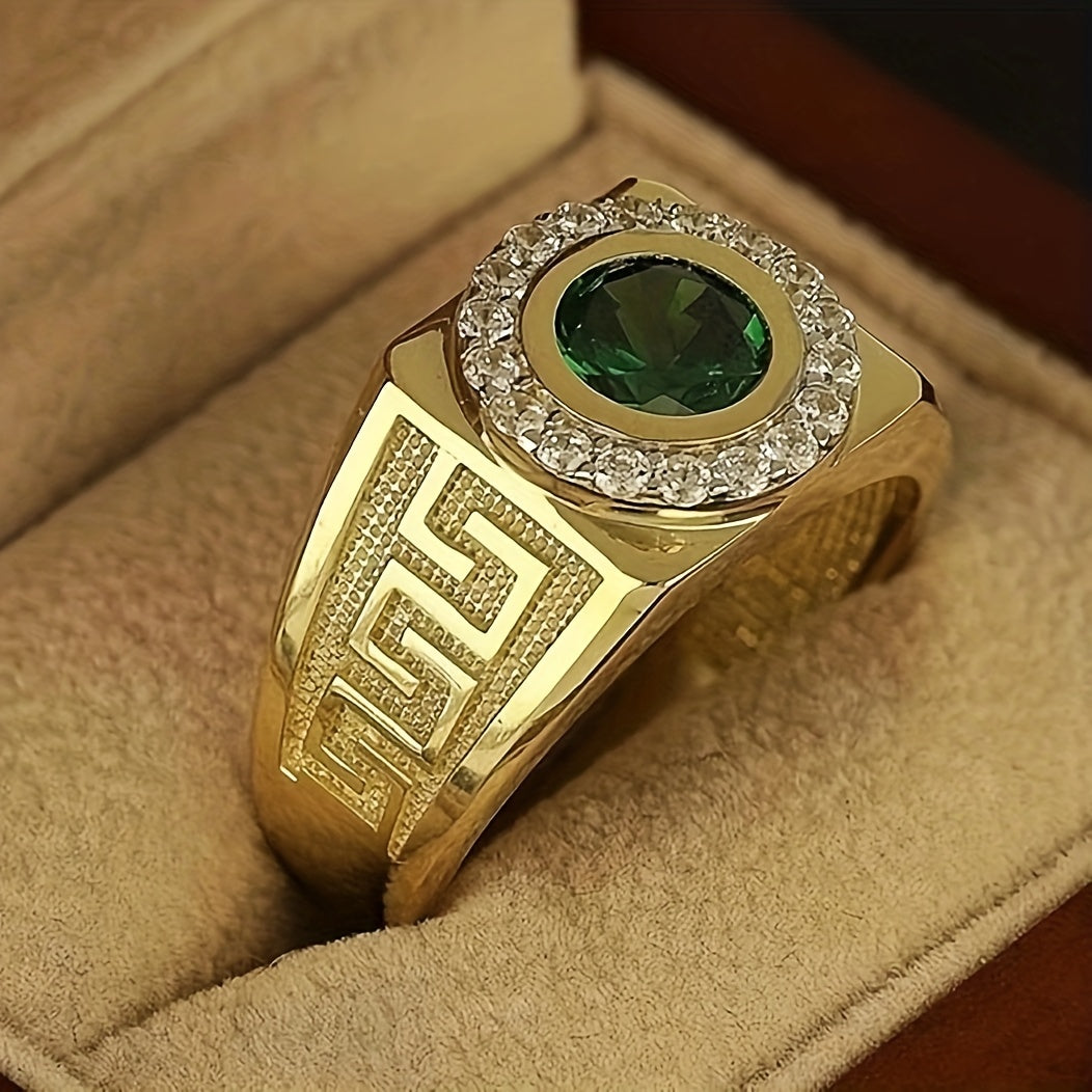 This business men's ring features a golden band with an artificial green gemstone, perfect for adding a touch of elegance to your look.