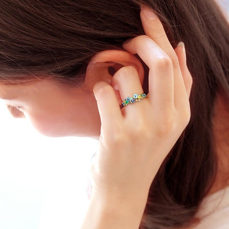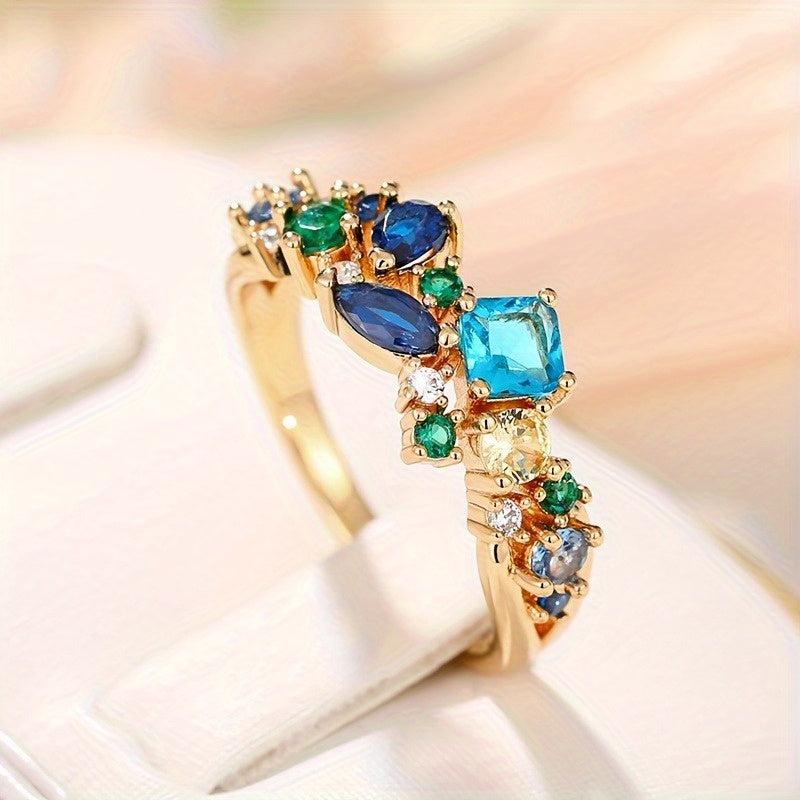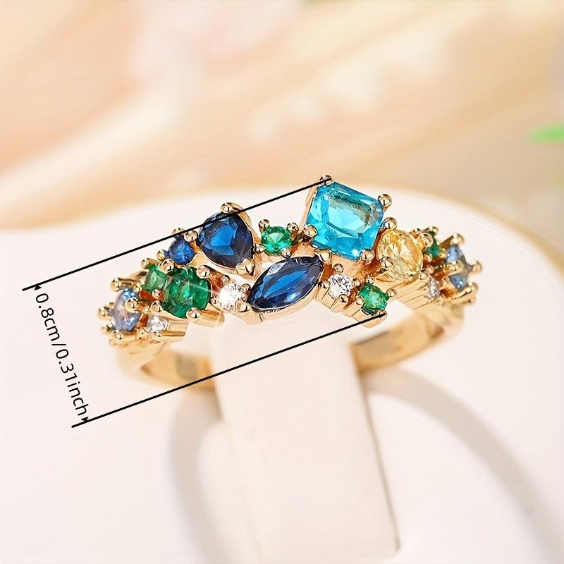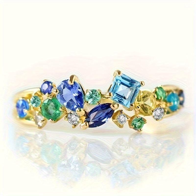 This women's ring features a blend of copper with KC golden plating, adorned with colorful synthetic sapphire and gemstone inlays. Perfect for daily wear, vacation, or as a birthday gift.