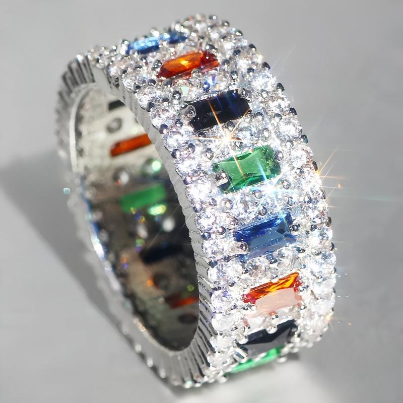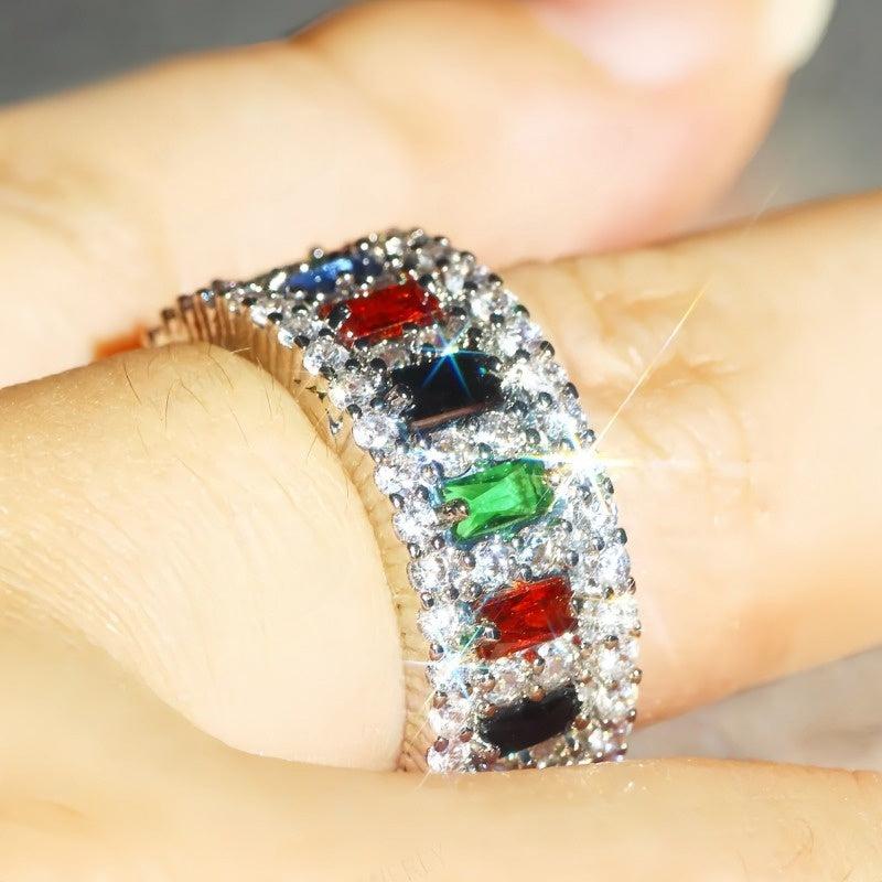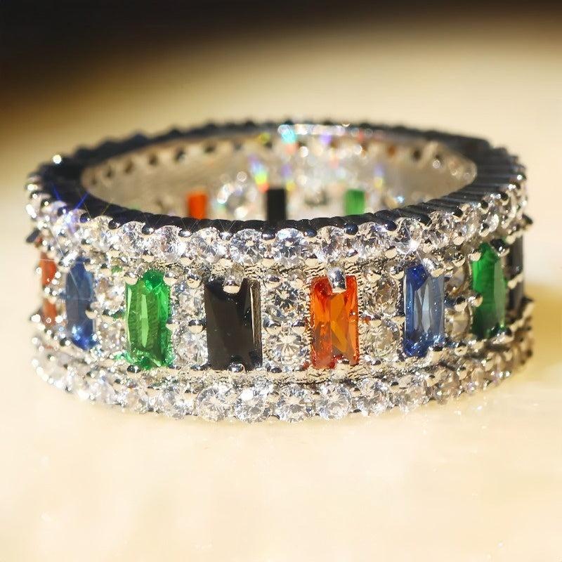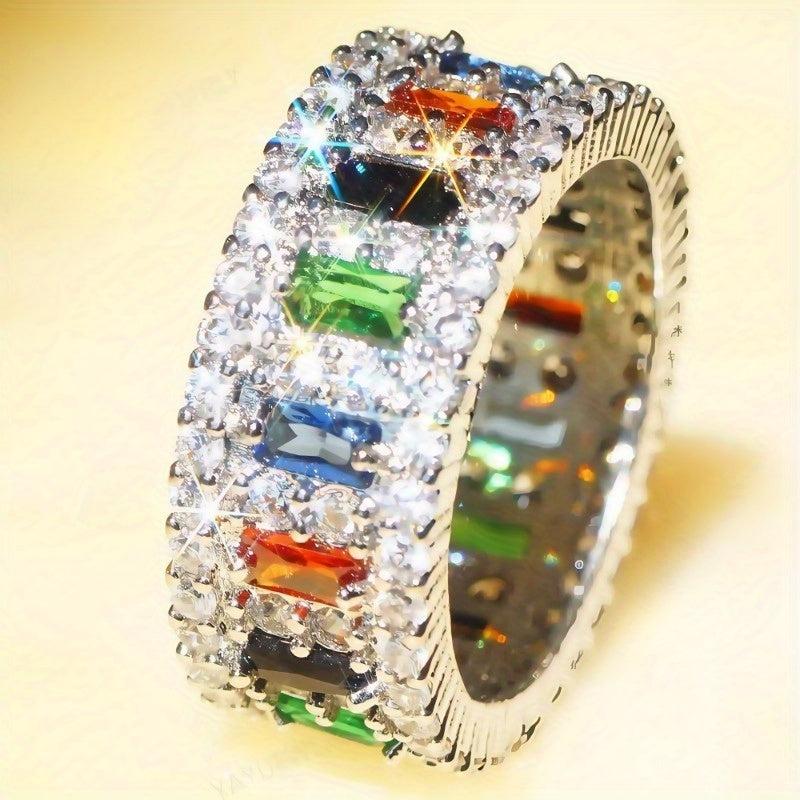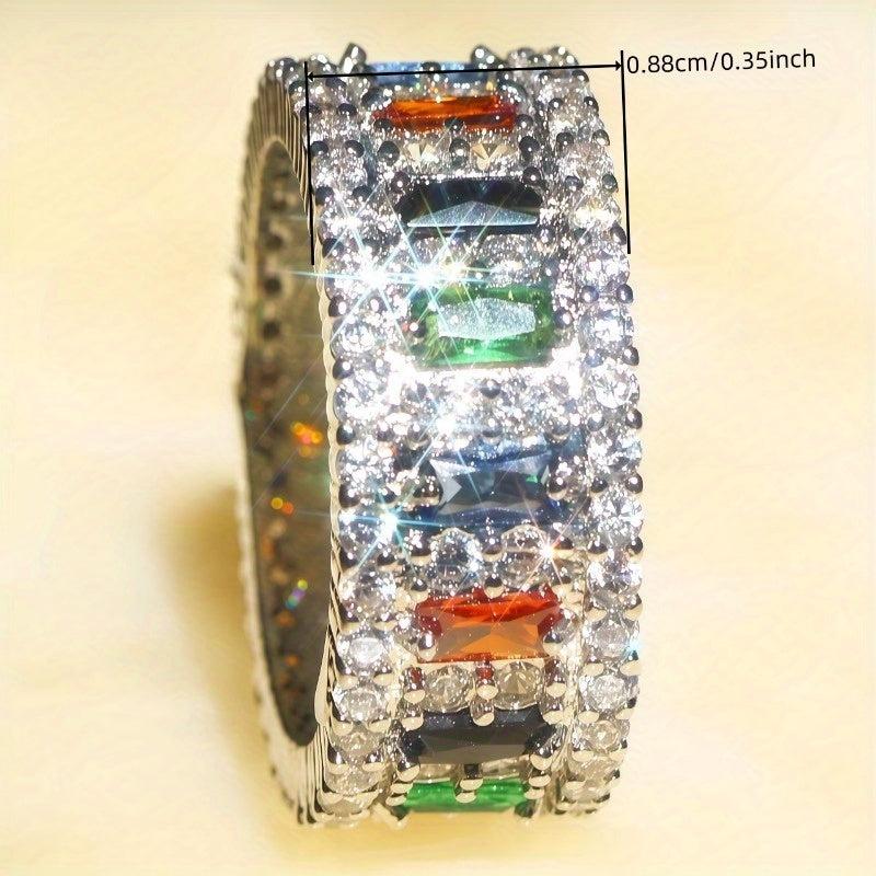 Celebrate Pride Month with this stunning women's ring featuring synthetic zirconia and a wide band design. The ring is golden plated and perfect for parties.