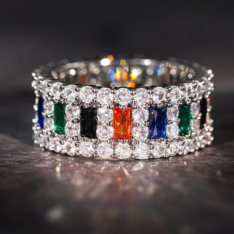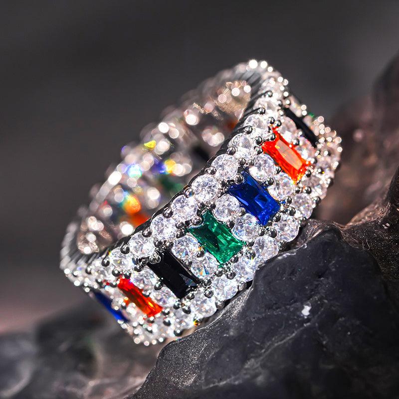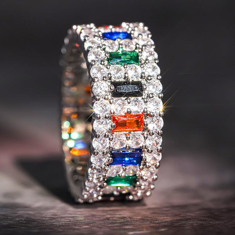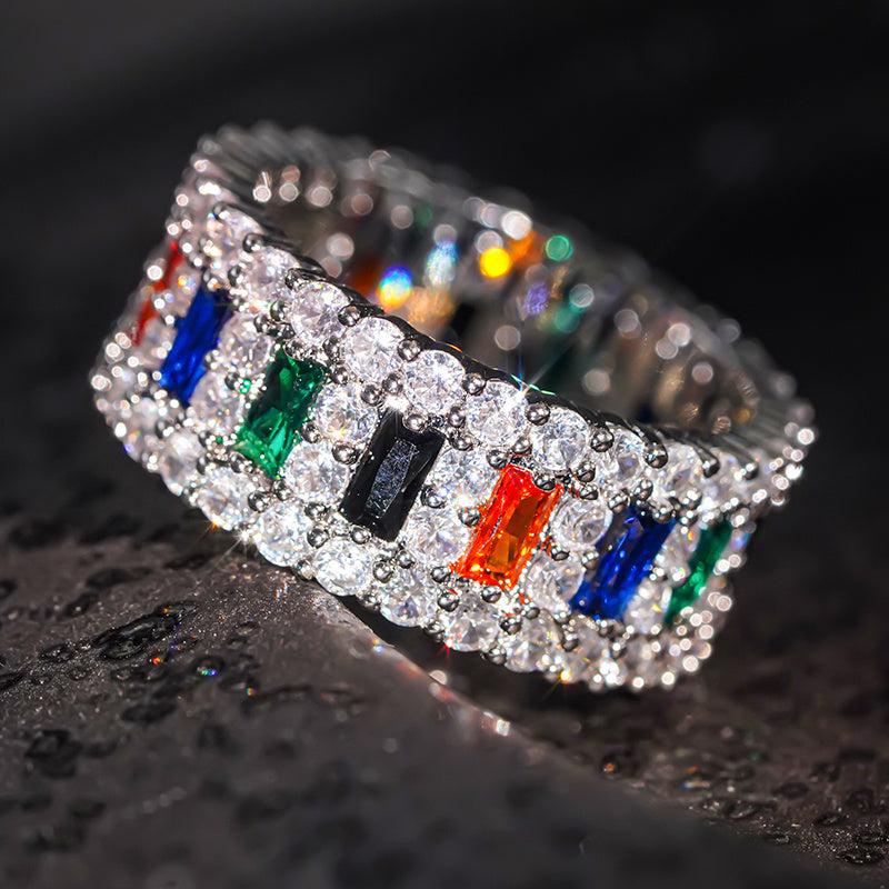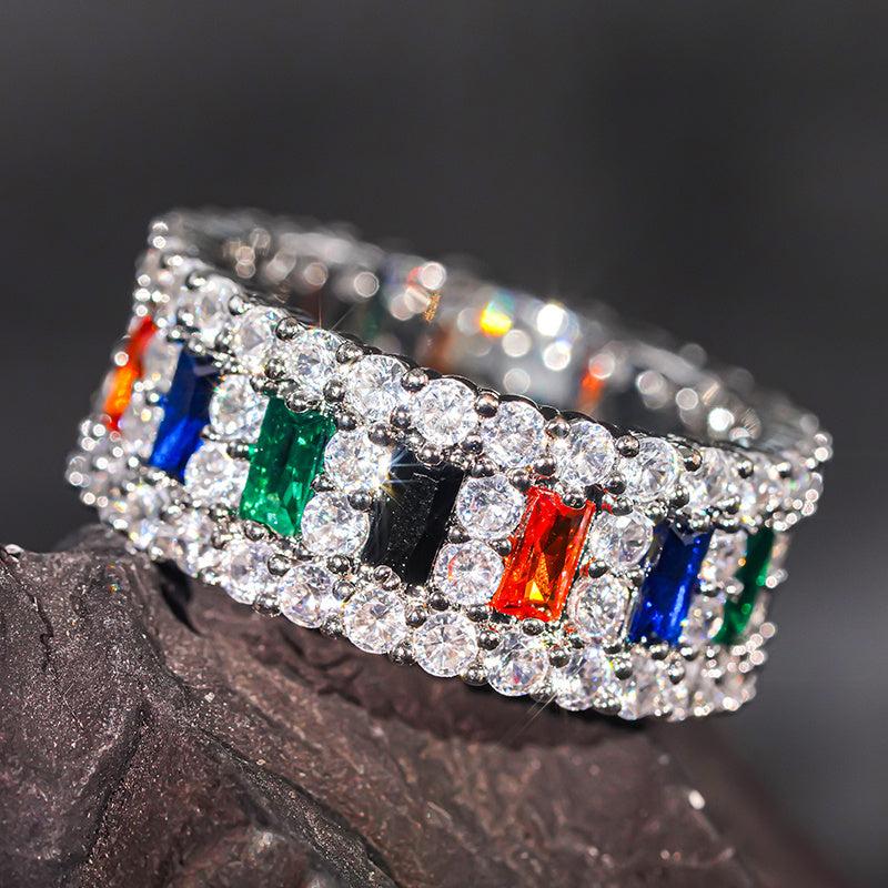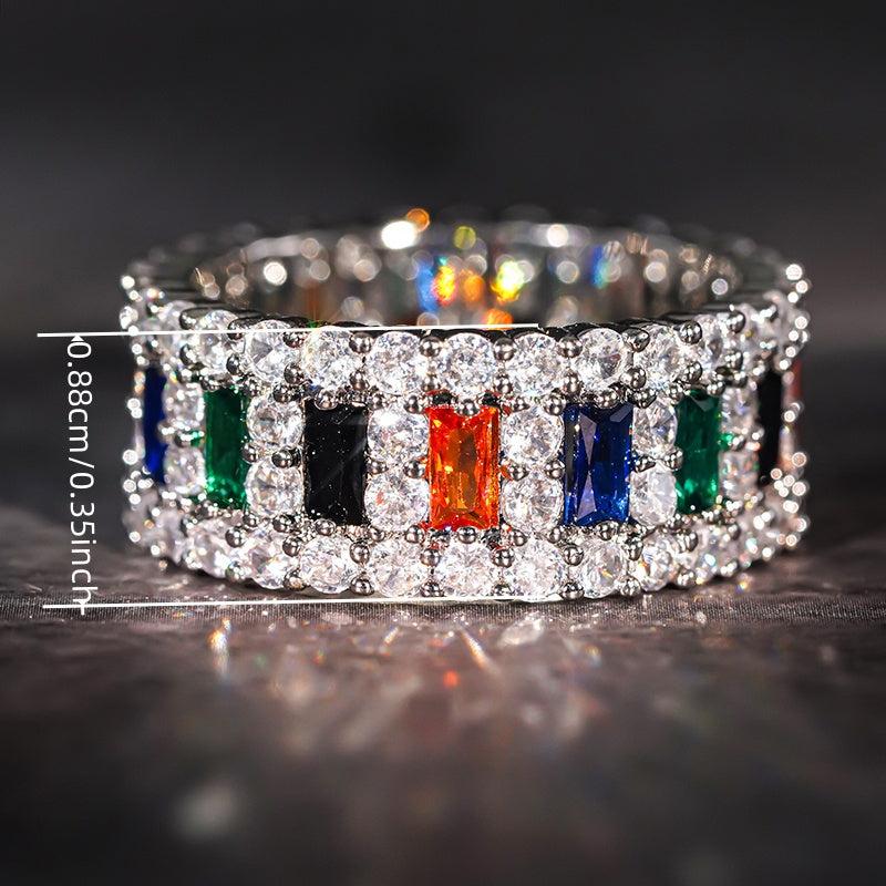 Add a pop of color and sparkle to your look with this colorful zirconia wide band ring. Perfect for weddings, daily wear, vacations, and parties.