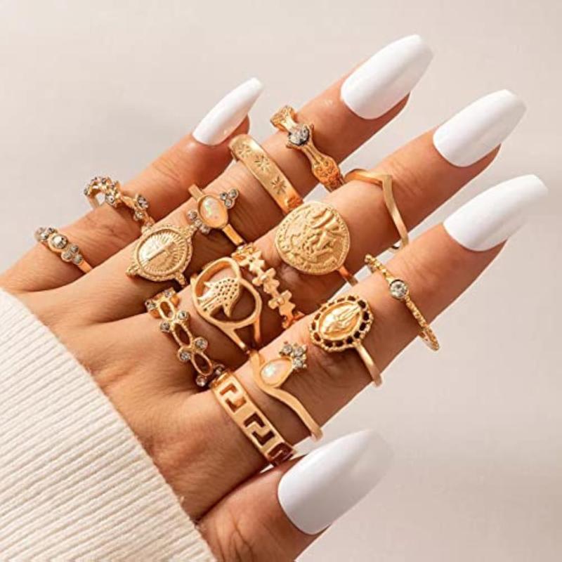 Elevate your style with this set of 15 stackable rings featuring a modern design. Made for mixing and matching, these plated rings add a touch of elegance to any outfit.