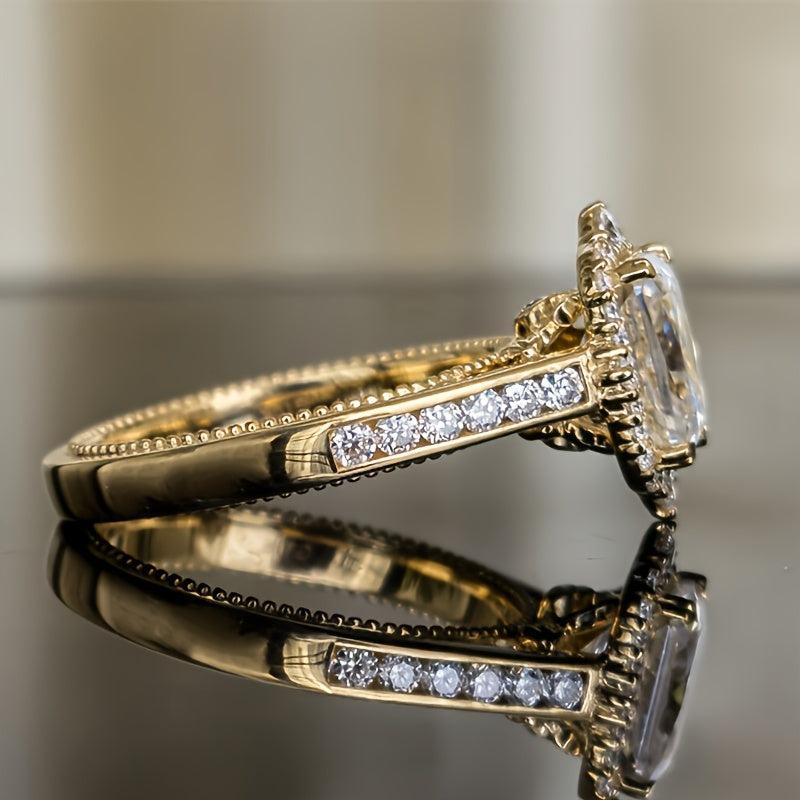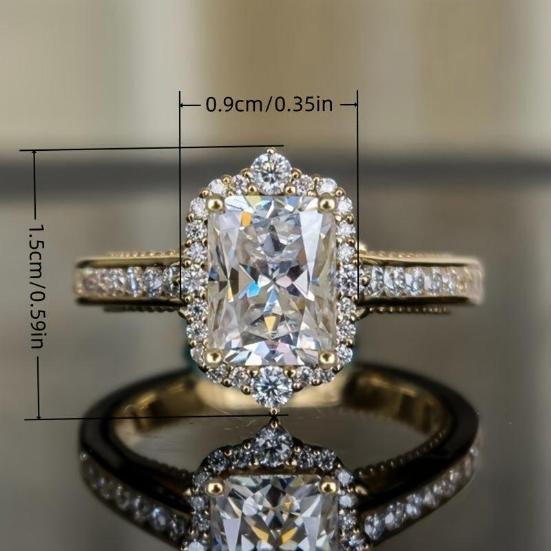 This stunning bridal engagement ring features a synthetic cubic zirconia stone in a rectangular prong setting. Perfect for all seasons and occasions.