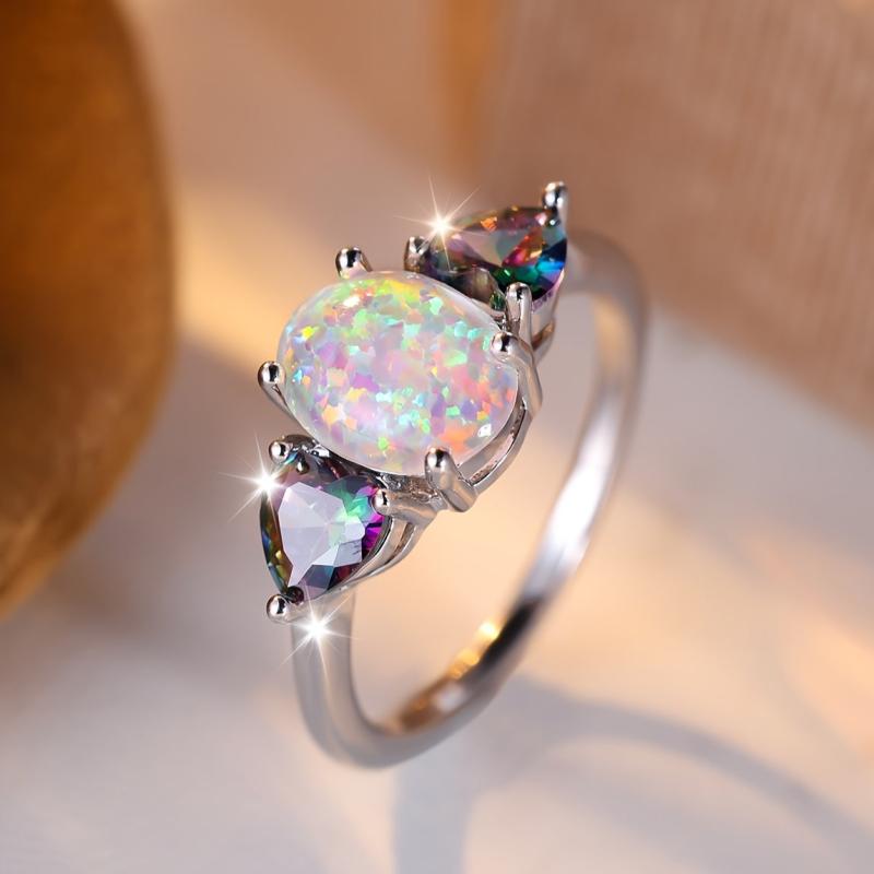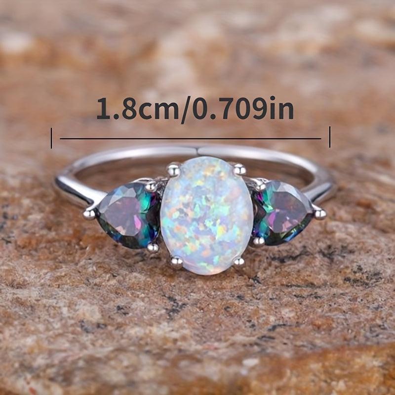 This stunning copper ring features a synthetic opal center stone surrounded by heart shaped rainbow zirconia accents. Perfect accessory for weddings and parties.