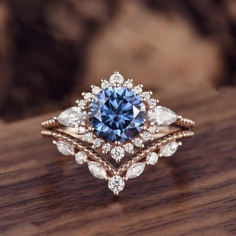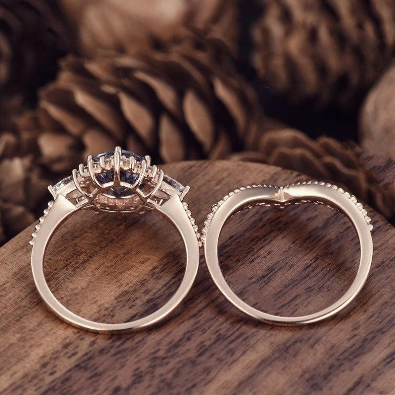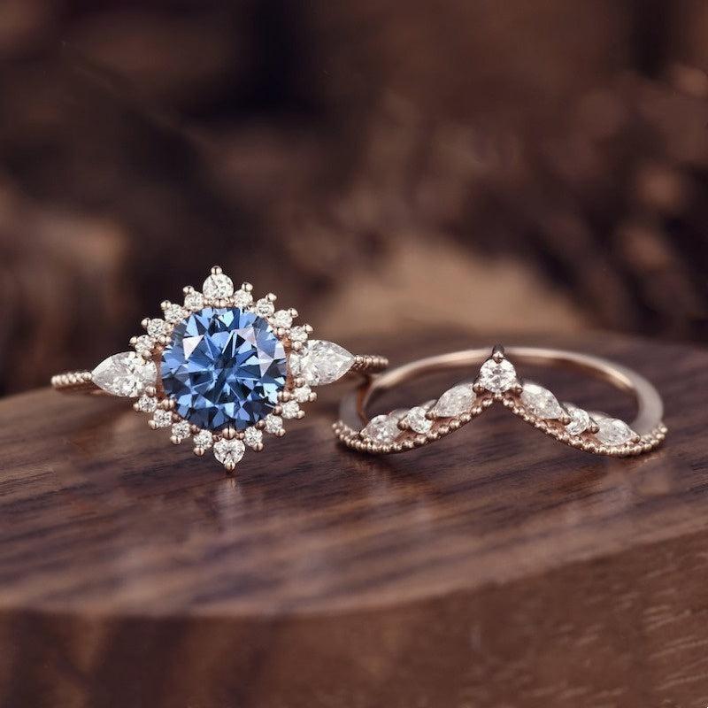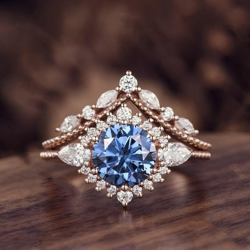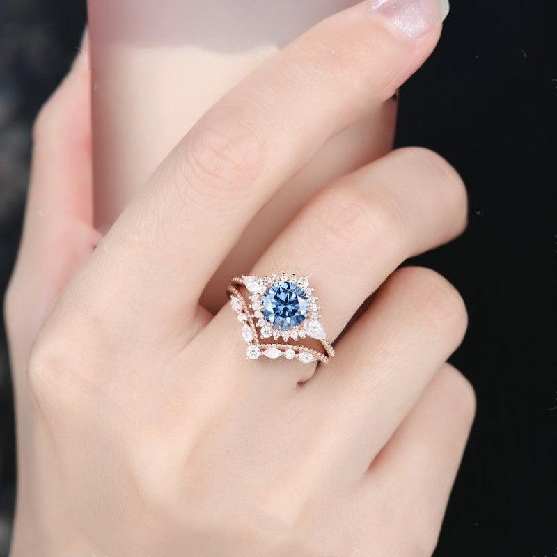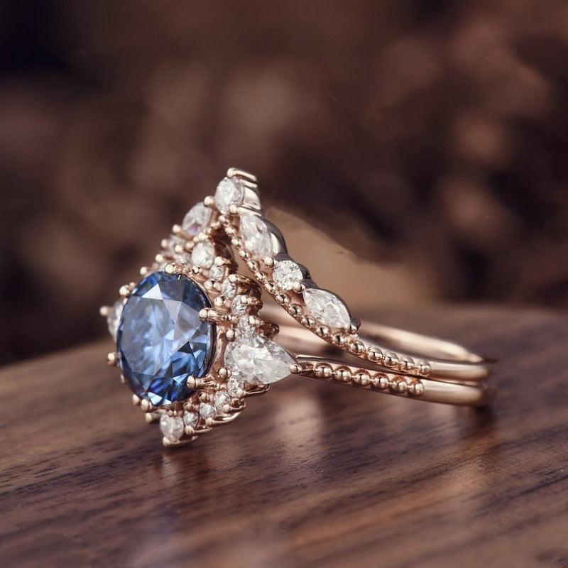 Elegant bridal ring set featuring a single stone mosaic with a synthetic September birthstone in a six prong setting. Perfect for daily wear or special wedding occasions.