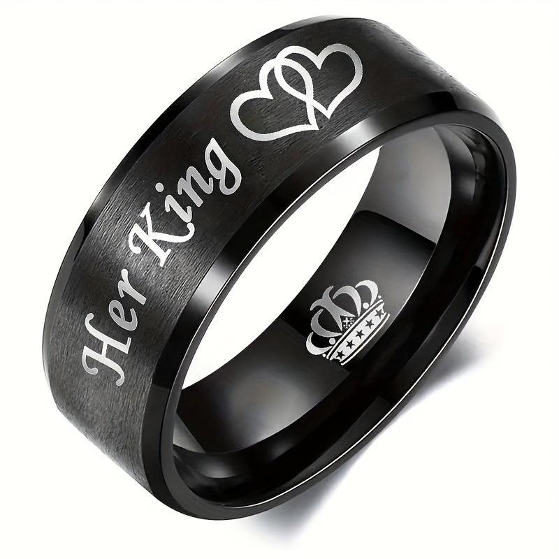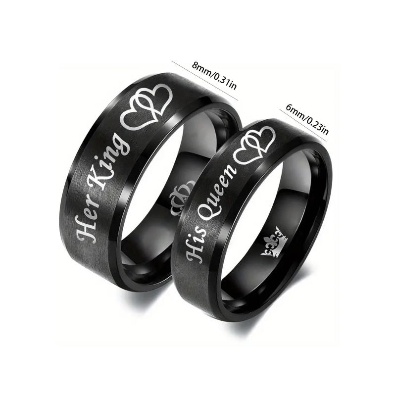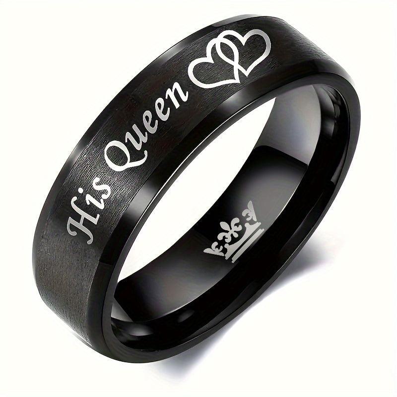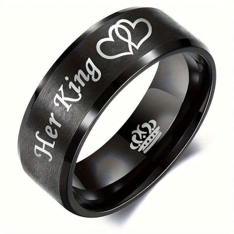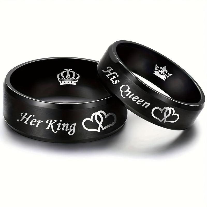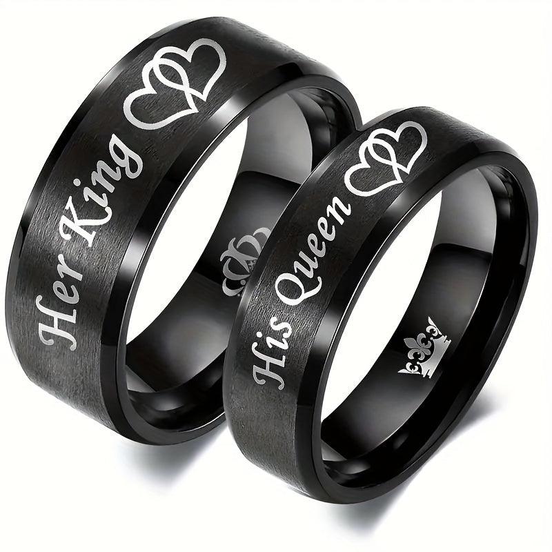 These wide band matching wedding bands feature crown and heart accents, perfect for casual attire or sporty accessories.