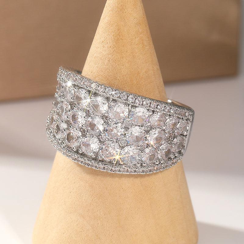 This elegant wide band ring features synthetic cubic zirconia stones that shimmer with brilliance. A perfect anniversary or wedding gift for her.