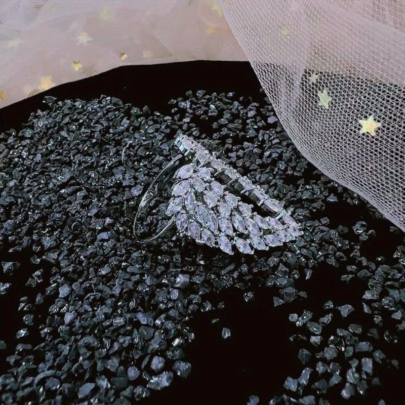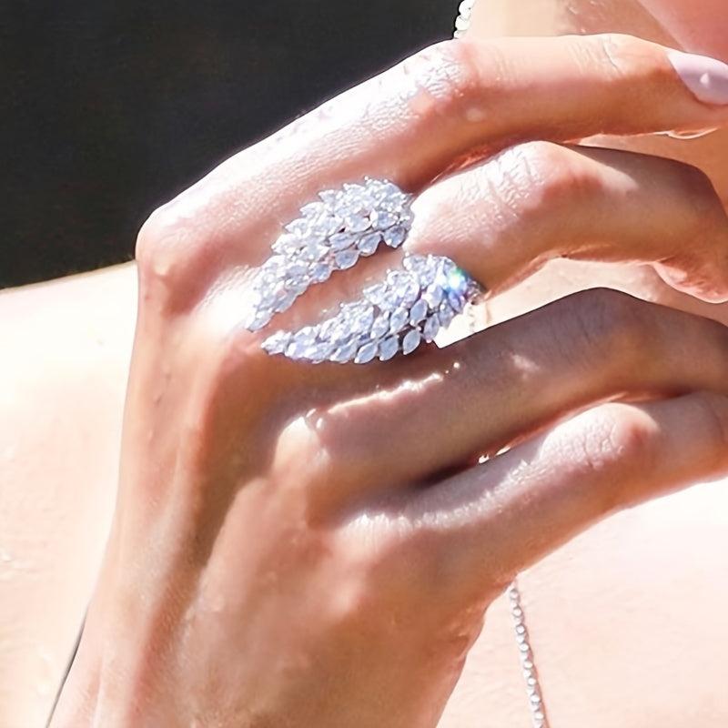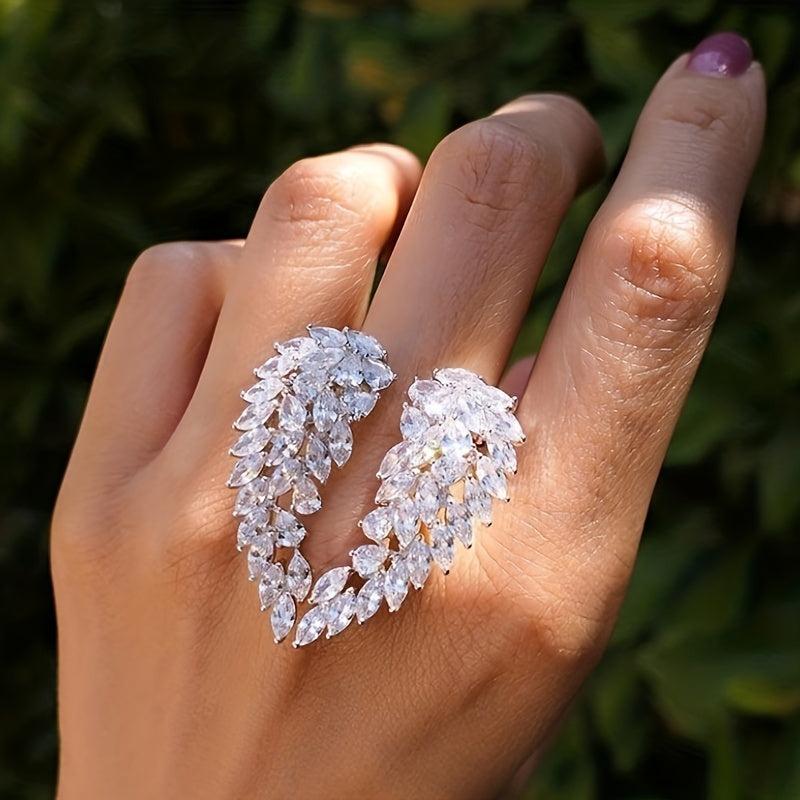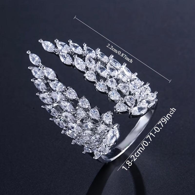 Add a touch of elegance to your evening party outfit with this stunning cuff ring featuring angel wing design and sparkling pave stones. Perfect as an engagement or wedding ring, it also makes a great gift for her.