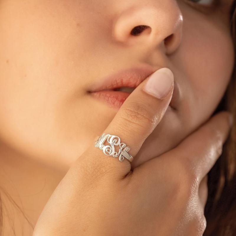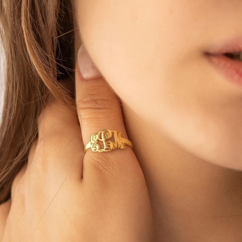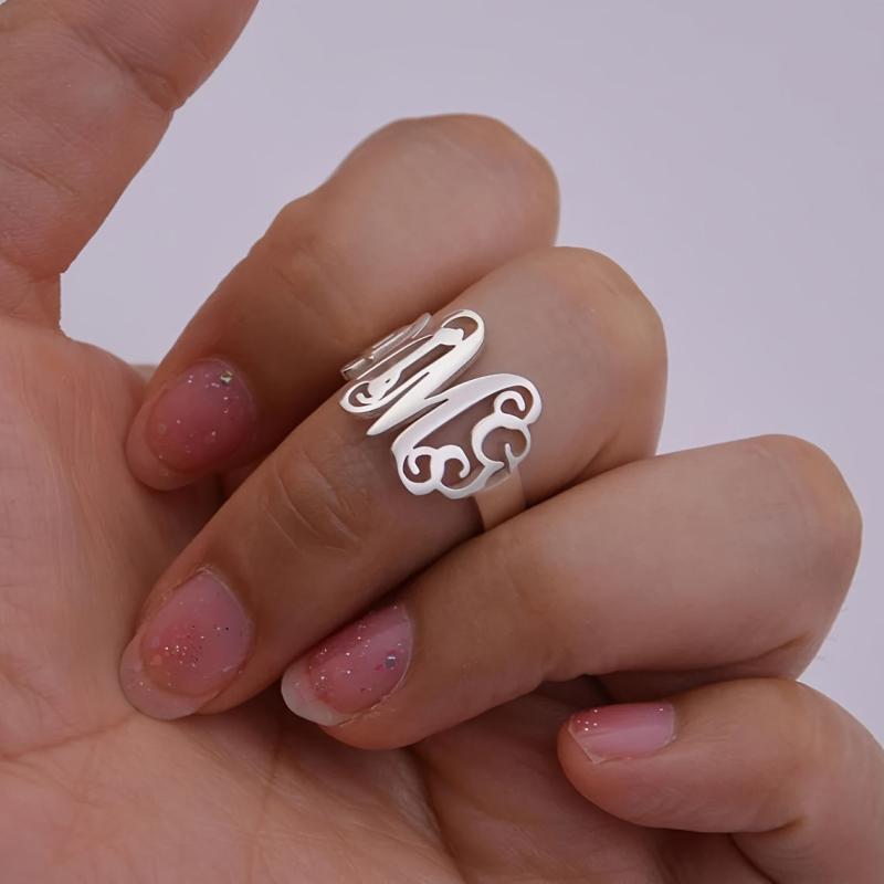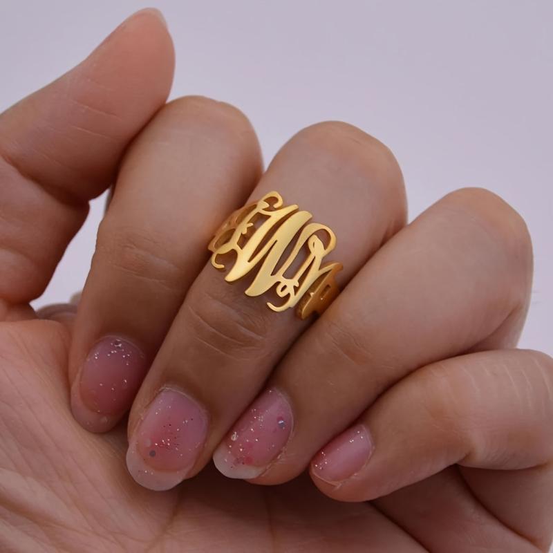 Unique hip hop style 3-letter intertwined cuff ring in 18K golden plated stainless steel. Adjustable design, perfect gift for mothers and special occasions.
