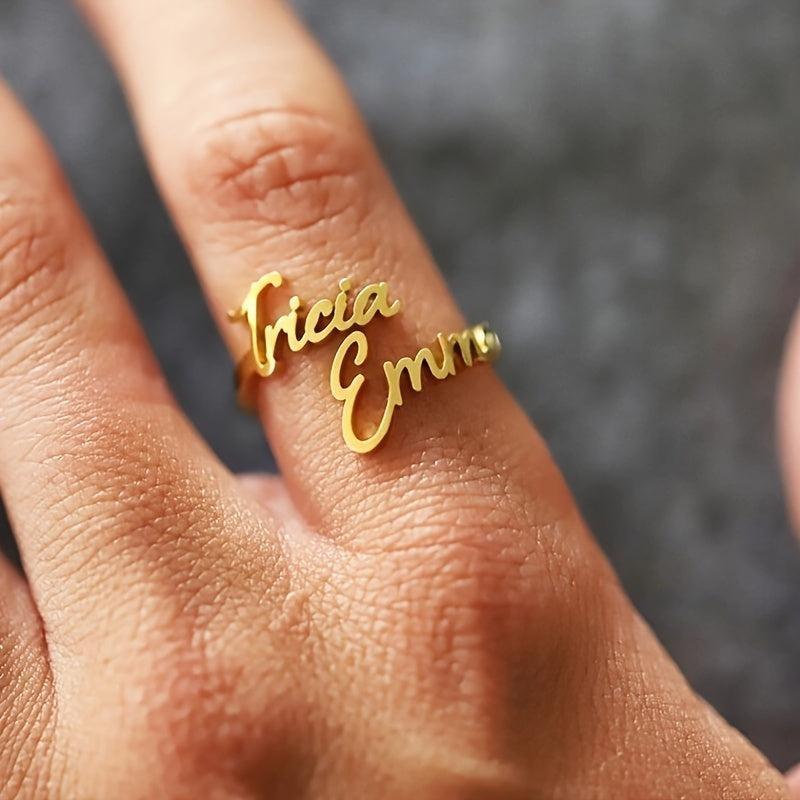 Make a bold statement with this custom stainless steel name ring featuring 18K golden plating. Personalize it with your name or a loved one's name for a unique and meaningful accessory.